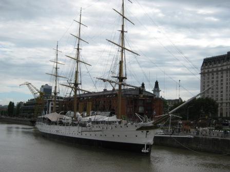 Passamos pelo Yacht Club Puerto Madero e pelo Buque Museu Fragata Sarmiento (Doca 3). A sua construção foi encomendada pelo Comodoro Rivadavia a um estaleiro em Birkenhead na Inglaterra em 1898. A fragata de 3 mastros, 85 metros de comprimento e 13 metros de largura, foi navio escola da Marinha Argentina. Após navegar 1 bilhão de milhas (39 viagens pelos mares em todo o mundo) parou de navegar em 1961. Pena que o museu fechou na hora em que chegamos.