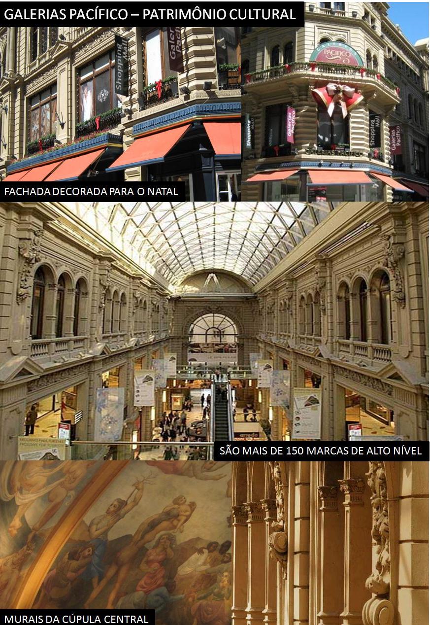 Também não se pode deixar de conhecer as Galerías Pacífico tidas como patrimônio cultural da cidade. Bem no estilo franco-argentino, a galeria tem mais de cem lojas, praça de alimentação, acesso à Internet, berçário e um posto de informações turísticas. É possível fazer um tour guiado para conhecer a história do prédio. Oferece ótimos descontos para turistas. É só mostrar o passaporte ou o RG.