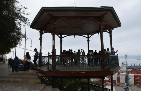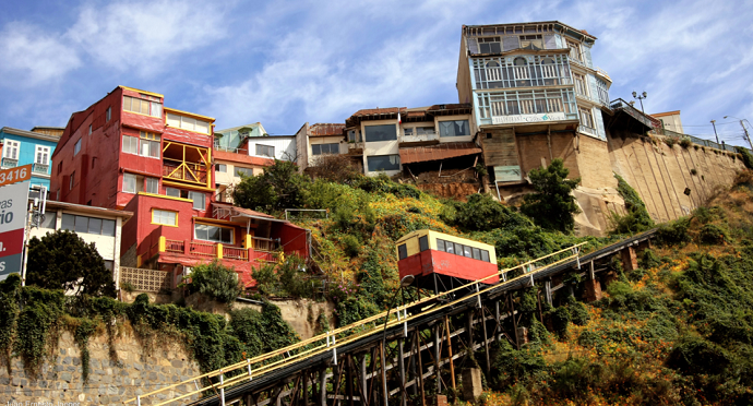 Nossa primeira parada foi em Valparaíso, uma cidade portuária dentre as mais antigas do Chile e cuja área histórica foi considerada Patrimônio Cultural da Humanidade pela UNESCO. Uma de suas características mais marcantes é a geografia repleta de ‘cerros’ ou morros à beira do mar.