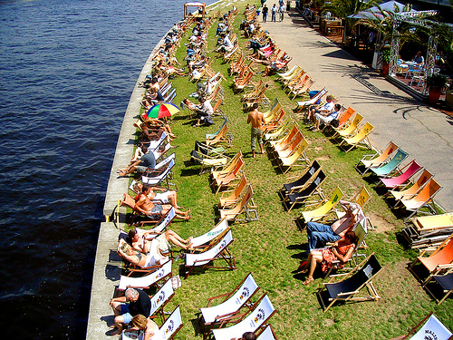 Não é só durante a madrugada que Berlim ferve. Durante a tarde e a noite o point onde a galera se reúne são os beach bars ou bares de areia, nas margens do rio Spree.