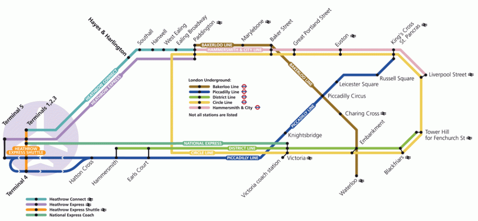 Há duas estações no aeroporto: uma no Terminal 5 e outra que serve os Terminais 1-3 (Heathrow Central). Chegando no Terminal 4, é preciso trocar de trem, mas isso é feito de forma rápida e não é cobrado nada extra. O preço da passagem é ₤16,50 (₤32,00 para ida e volta) se comprada na máquina no próprio aeroporto, ou ₤19,50 se comprada dentro do trem.