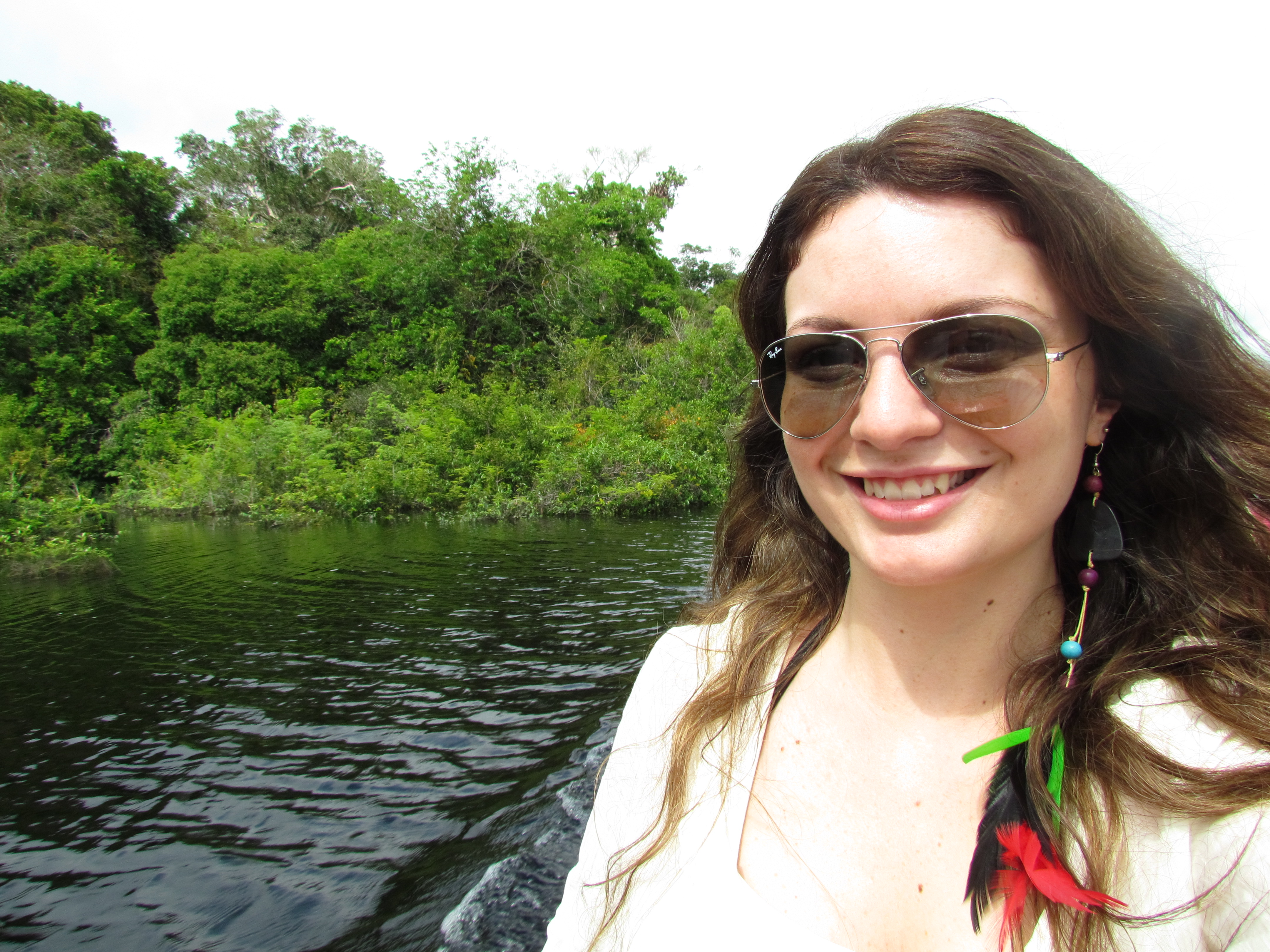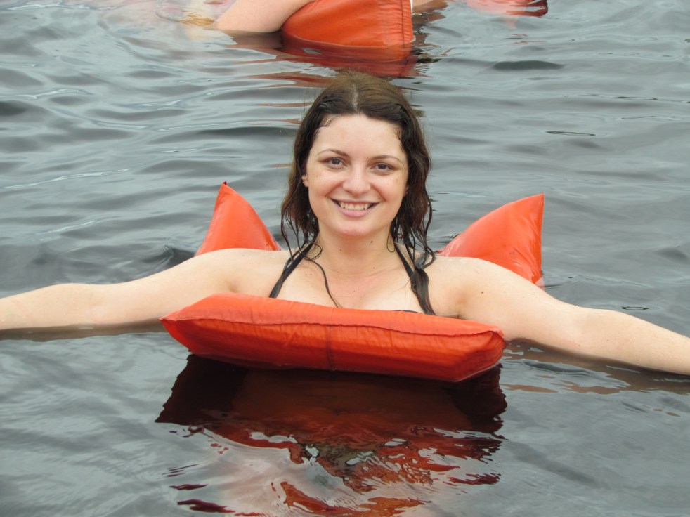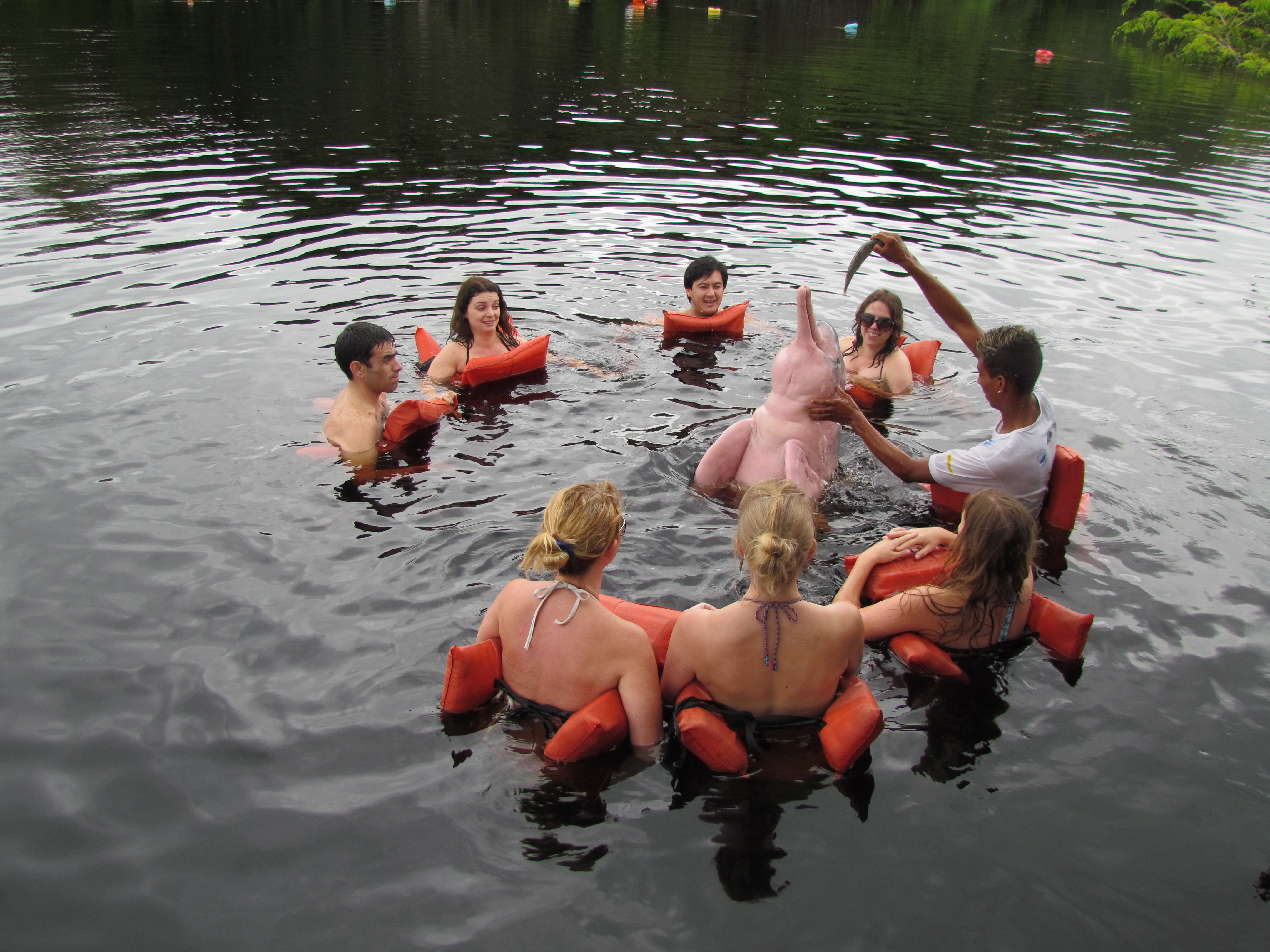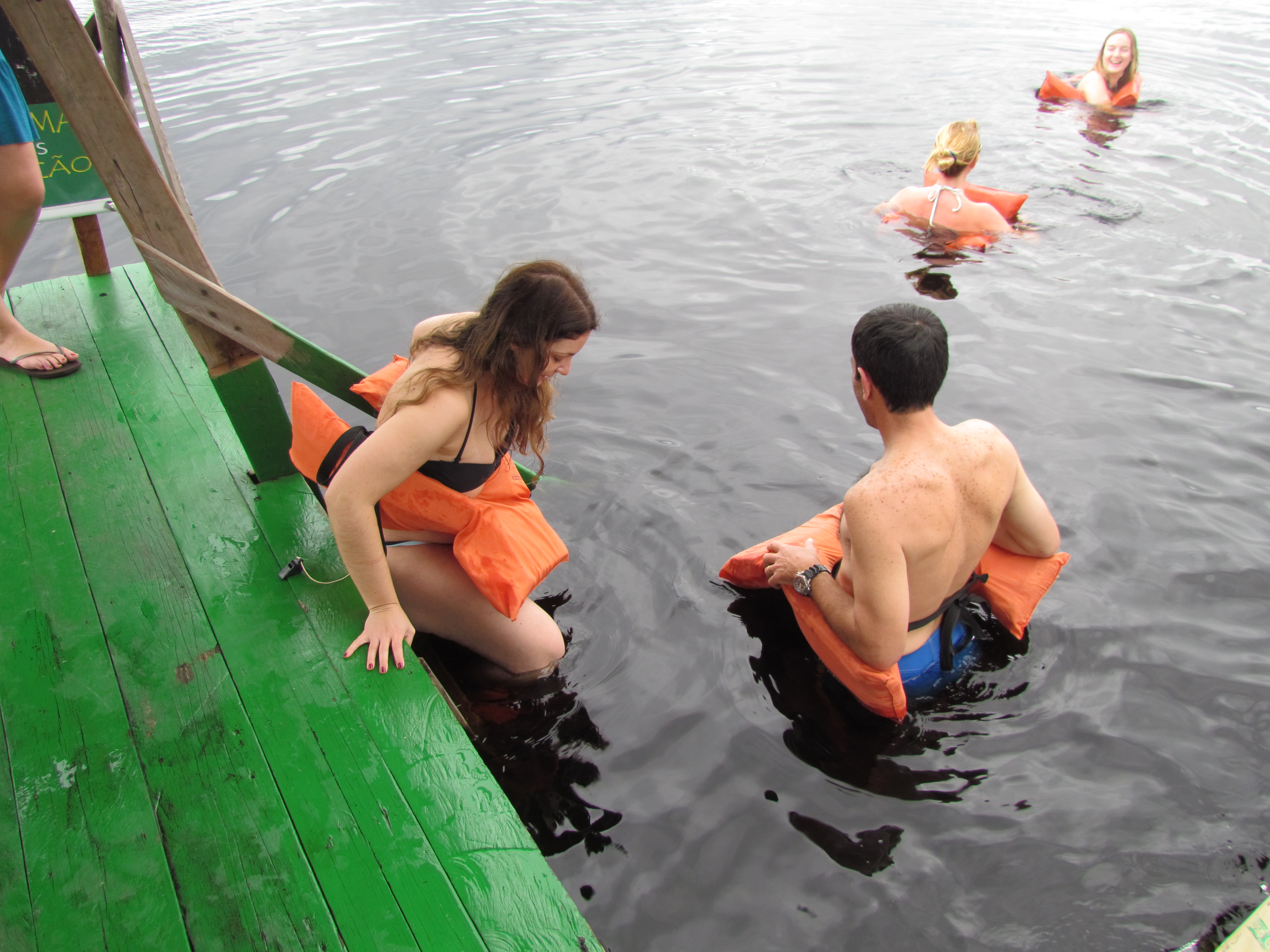Depois de desembarcar o guia nos entregou os salva vidas para que pudéssemos boiar na água e não ter que ficar nadando. A princípio ficamos com medo de entrar na água por causa das piranhas, mas depois descobrimos que elas não ficam nessa área porque os botos as comem.