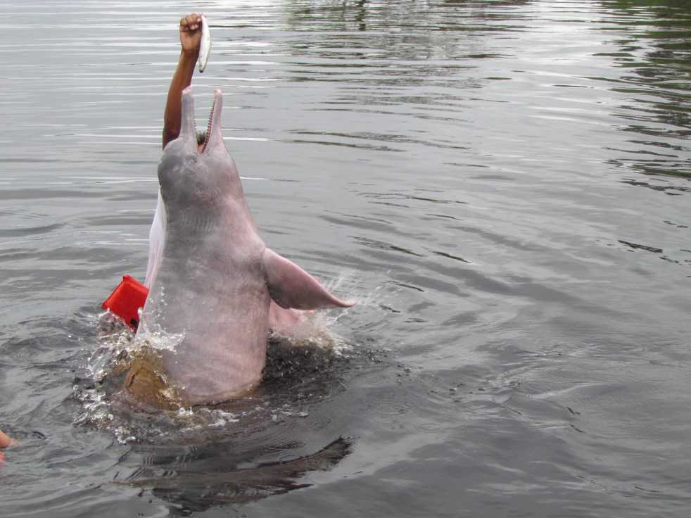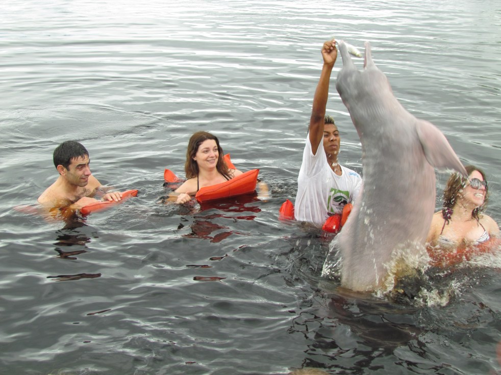 O guia entra junto na água e assim que o primeiro peixe é arremessado na água vários botos começam a aparecer um atrás do outro. E eles são enormes, chegam a medir até quase 3 metros. Eles são dóceis e fazem muitas piruetas e esbarravam na gente o tempo todo.