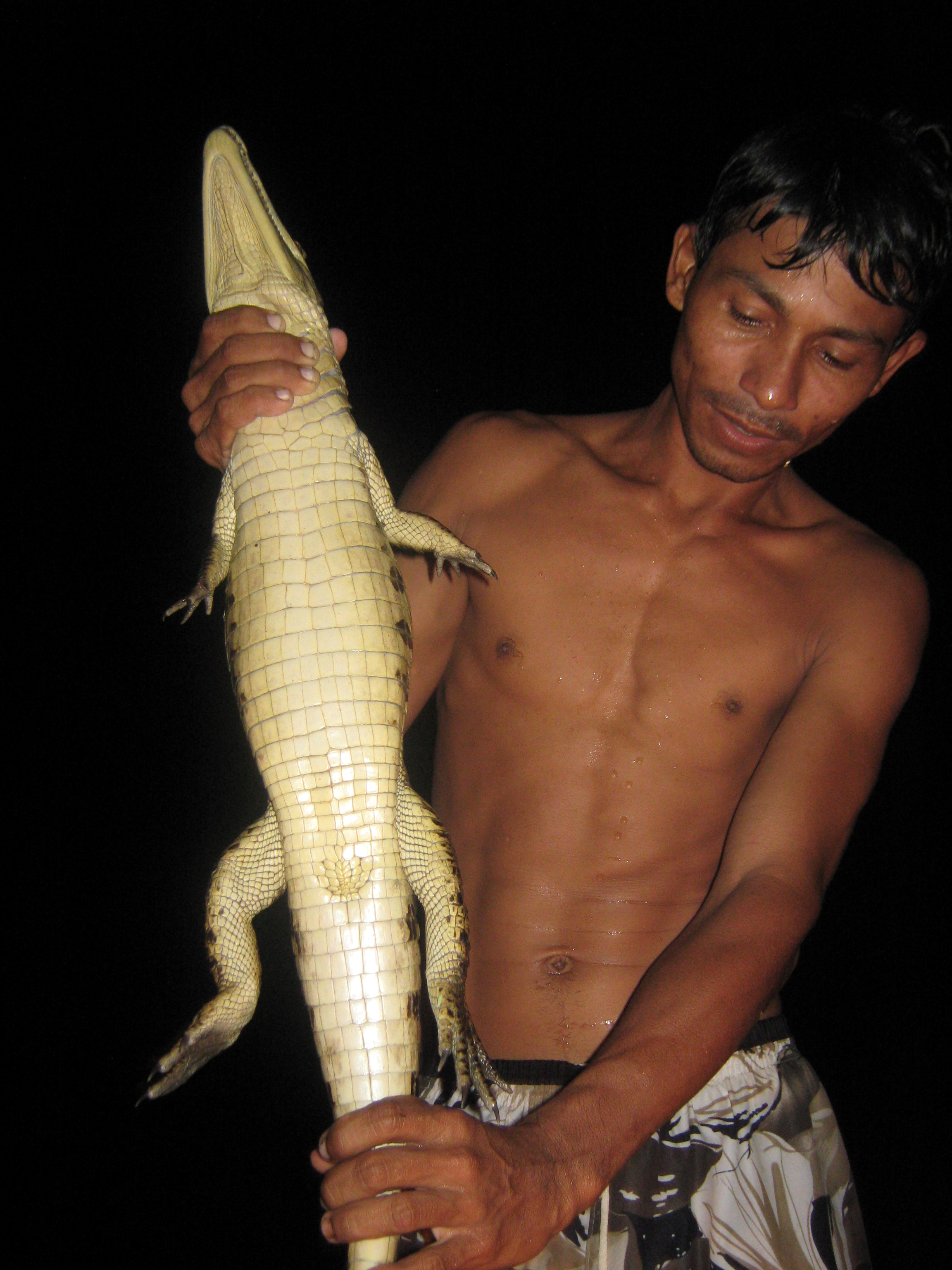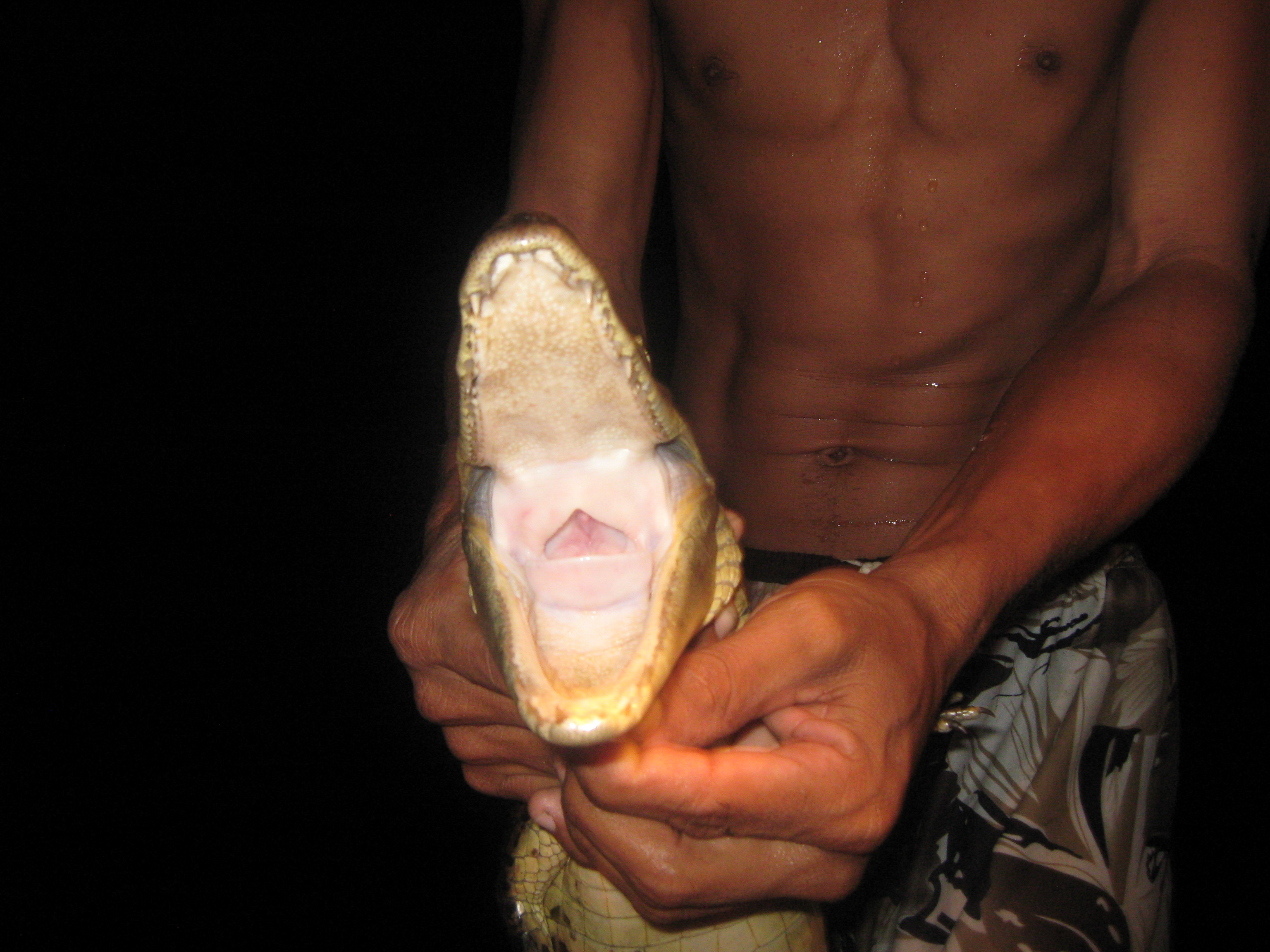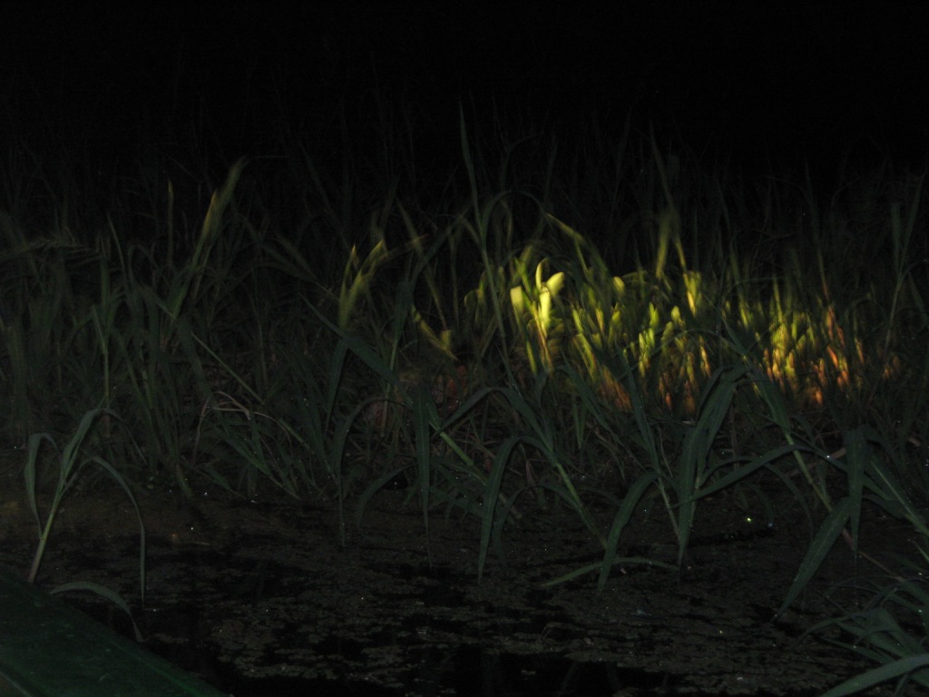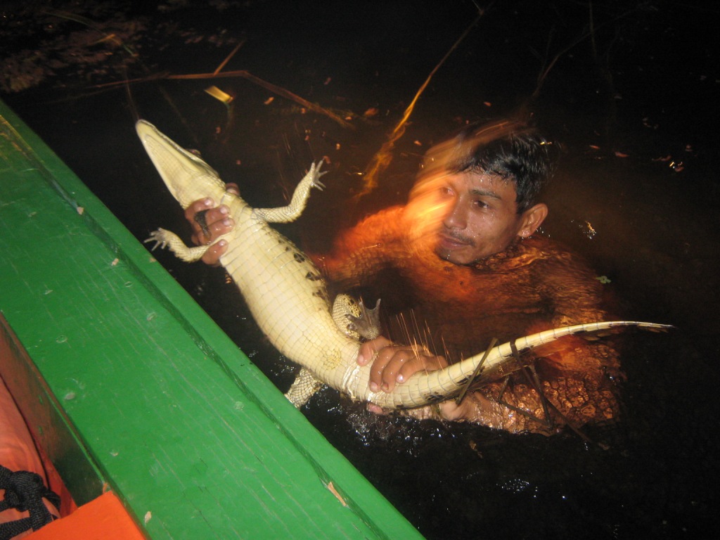 Em um breu total, dentro de uma canoa motorizada, somente um farol ligado à uma bateria de carro iluminava o caminho até os igarapés, local favorito dos jacarés. Sob a luz da lanterna, os jacarés ficam paralizados e seus olhos brilham na escuridão.