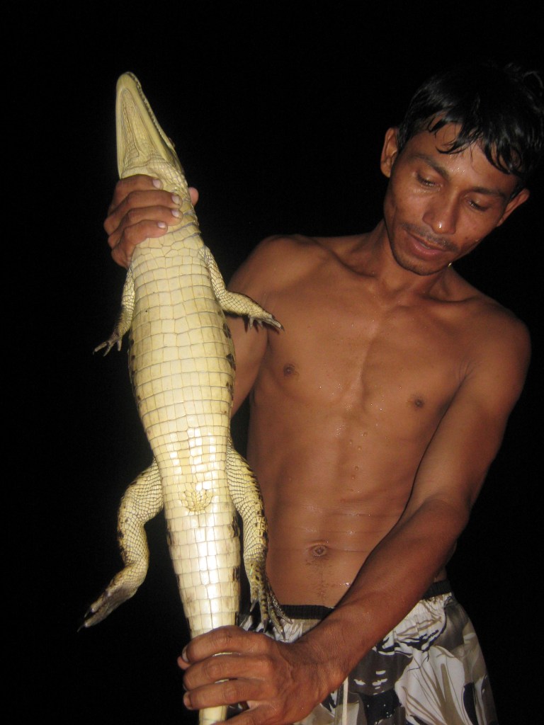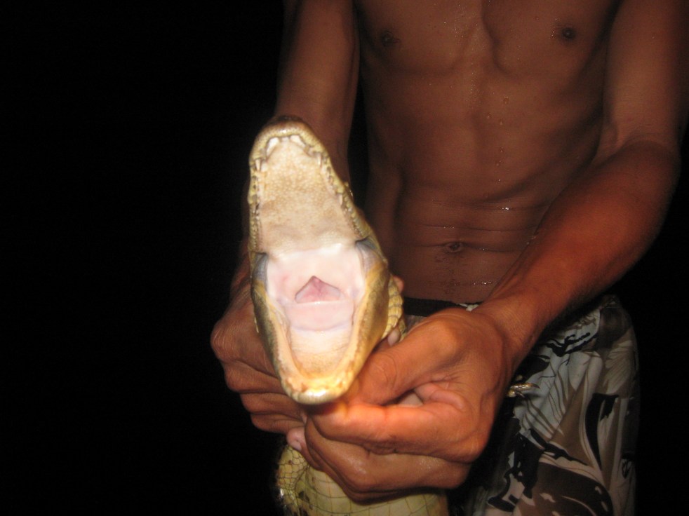 De repente Chiquinho salta dentro d’água e agarra nosso jacaré… foi na terceira tentativa, mas tá valendo… o cara é o Crocodilo Dundee da Amazônia.