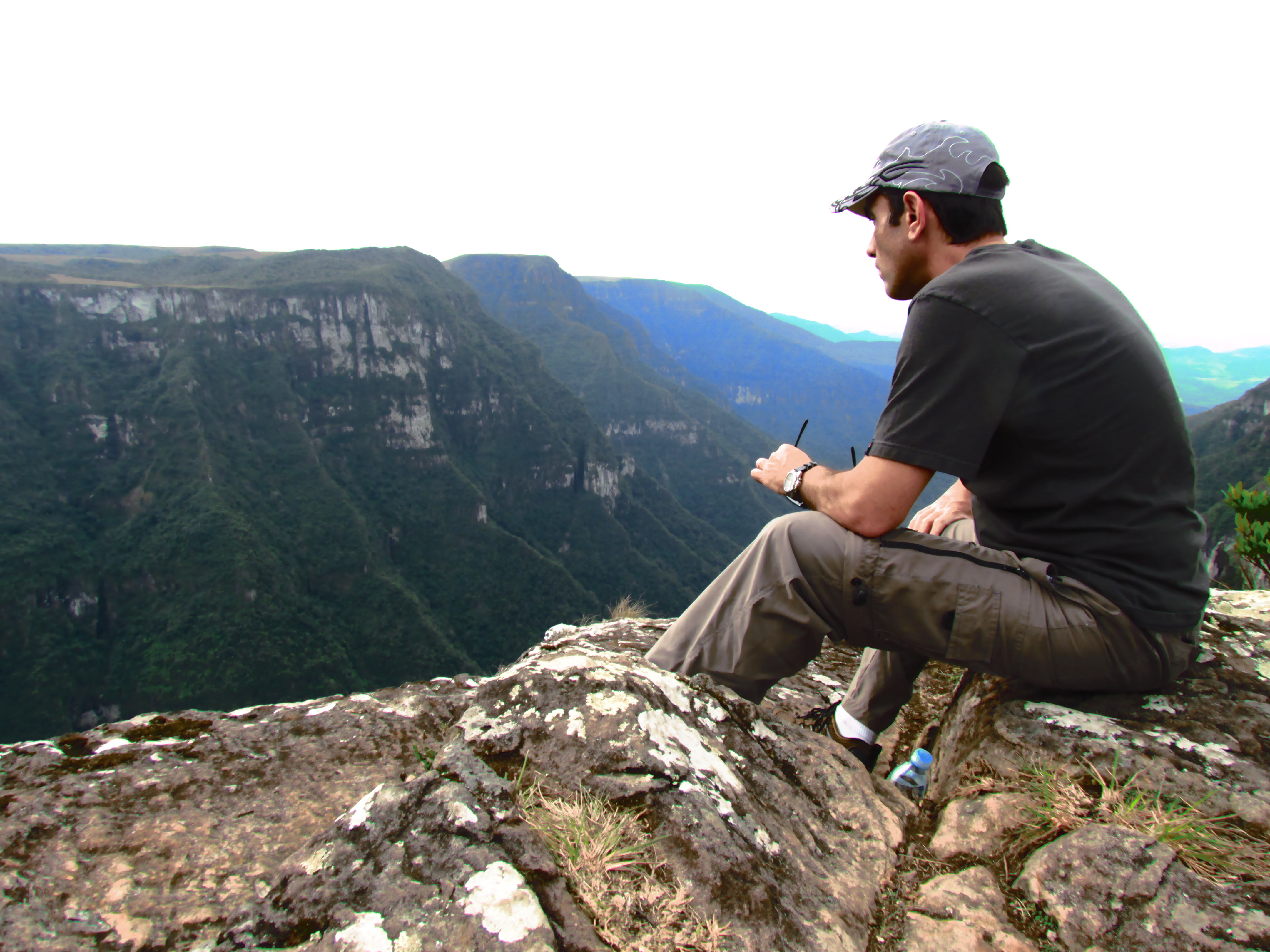 Aproveitamos para sentar nas pedras e curtir a vista panorâmica dos paredões, do caminho traçado pelo Rio da Pedra, que corre na parte de baixo e do vôo das águias cinzentas que ali vivem e que estão ameaçadas de extinção.