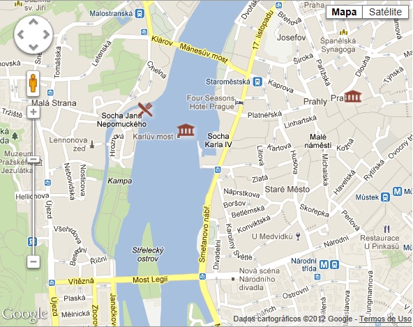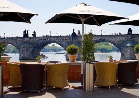 O restaurante tem quatro ambientes: o restaurante principal, um terraço aquecido à beira do rio com vista para a Ponte Charles, um jardim de inverno com vista para um dos afluentes do rio Vatlava e um terraço sem aquecimento (ideal para as noites quentes) também com vista para a Ponte Charles. Recomendo ficar em um lugar com vista para a Ponte.