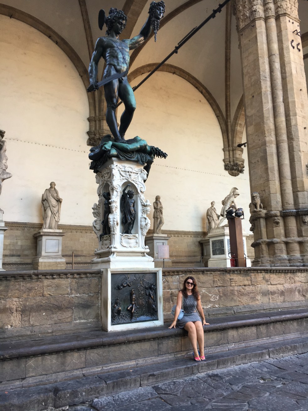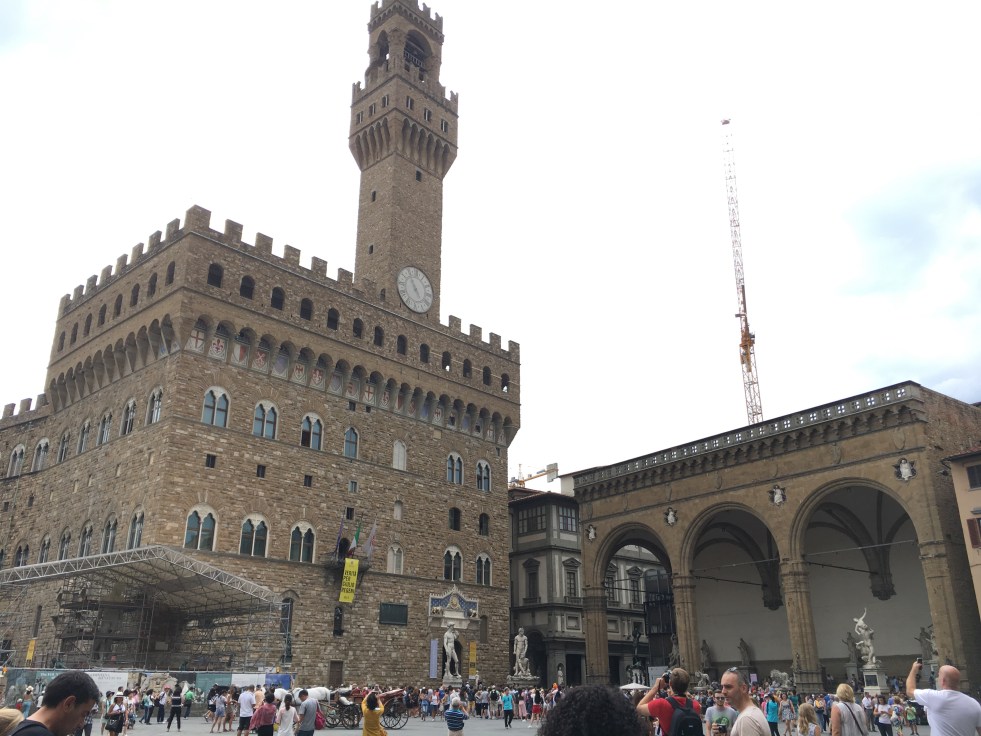 A praça é linda e um museu ao ar livre. Está rodeada por estátuas, dentre elas a cópia de David, de Michelangelo, cuja original está na Galerie dell’Academie. Estátuas de Judith e Holoferne de Donatello e a Fonte de Netuno de Bartolomeo Ammannati.
