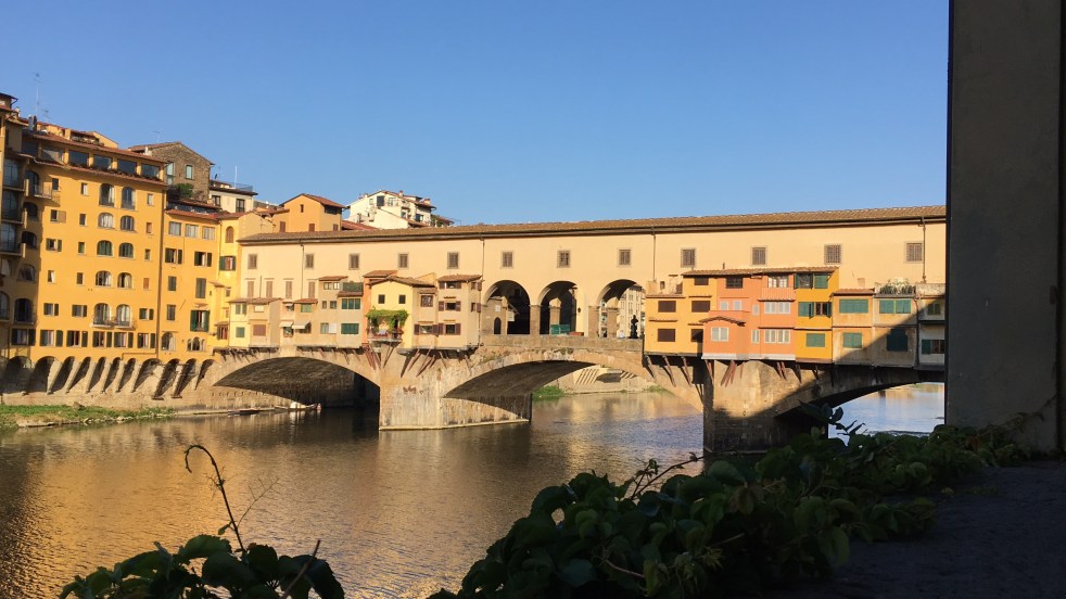 A Ponte Vecchio foi construída em 1345, primeiramente em madeira e depois em pedra e tendo resistido à Segunda Guerra Mundial, é a ponte medieval mais famosa de Florença. Ao longo da ponte existem várias joalherias e ourives e isso se deve a um fato curioso: As lojas pertenciam no século XIII a açougueiros e todo o lixo era jogado no rio Arno.
