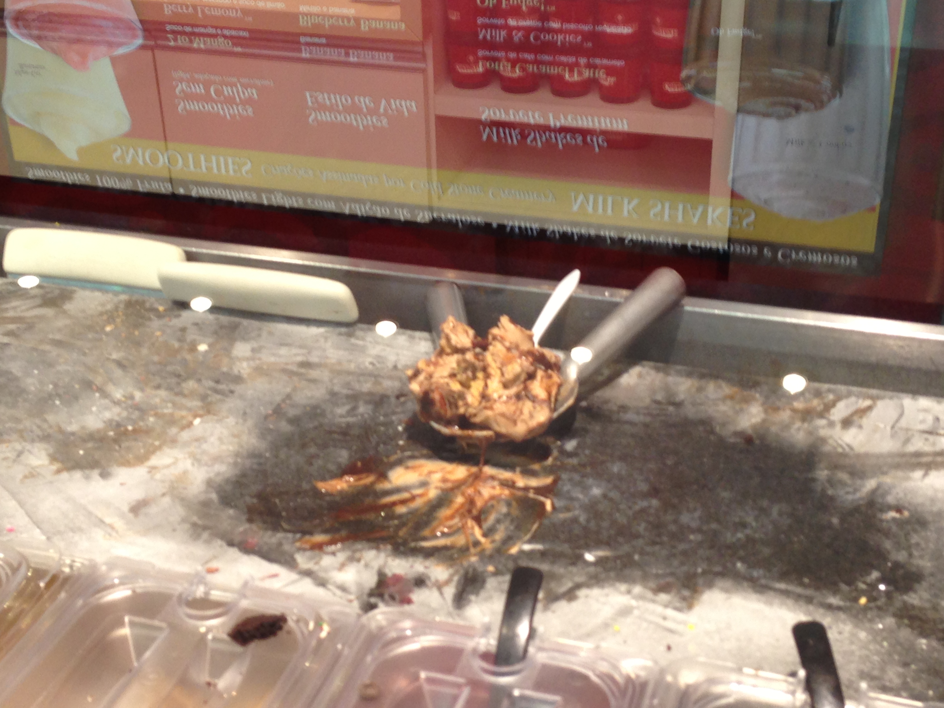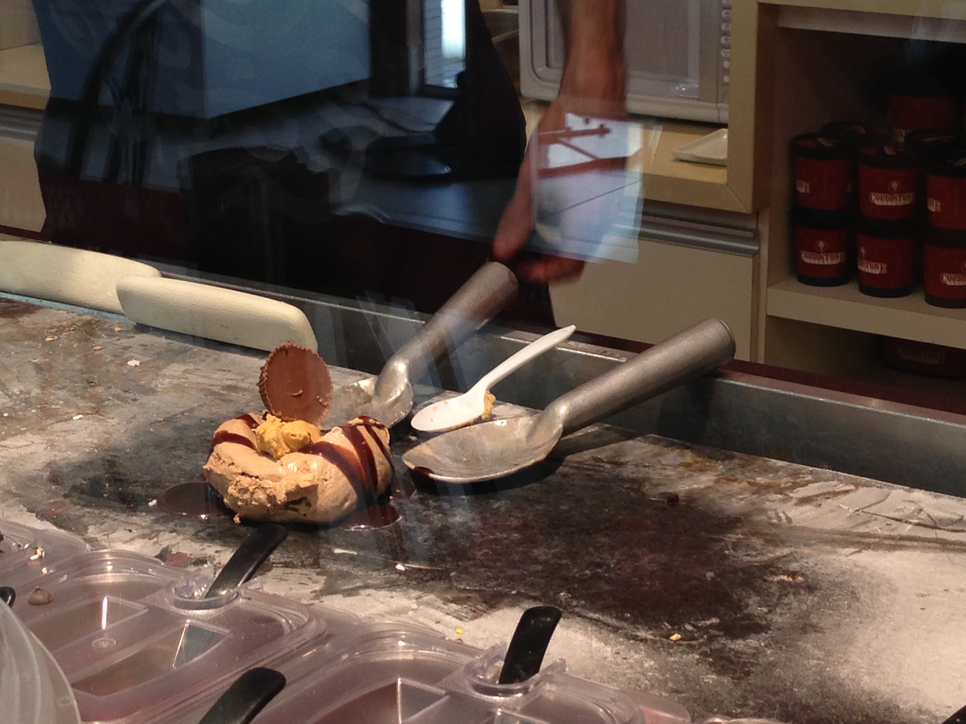 Até aí nada de novo, mas o legal é que todas essa mistura é feita com uma espátua em cima de uma pedra gelada ‘cold stone’ o que agrega todos os ingredientes e faz parecer como se o sorvete tivesse nascido assim.