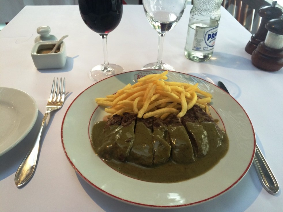 Quanto ao prato principal, a carne estava excelente nos dois restaurantes, mas gostei mais do molho do L’entrcot de Paris. A receita é basicamente a mesma, a bade de mostarda e ervas mais achei o de Paris mais saboroso.