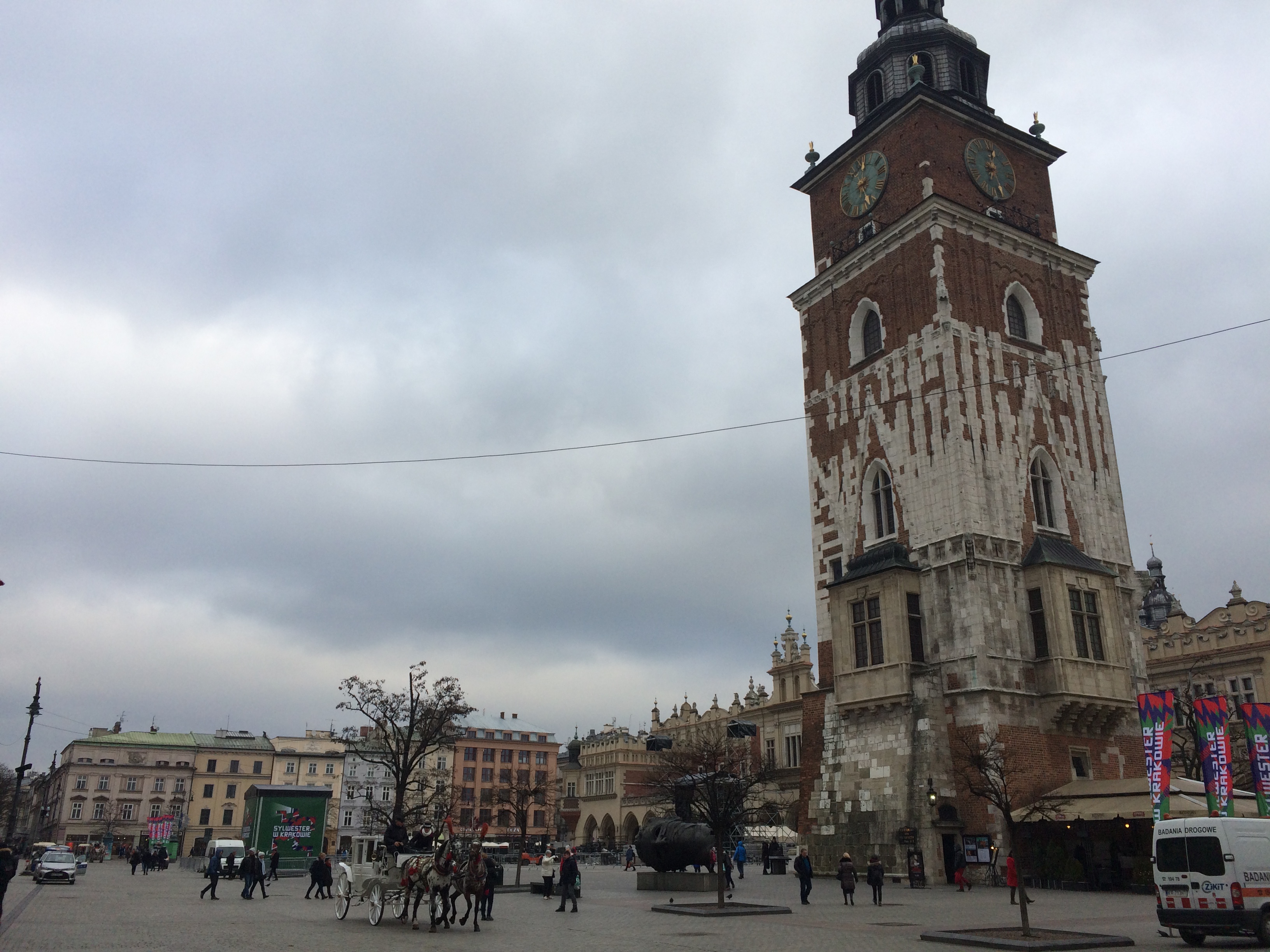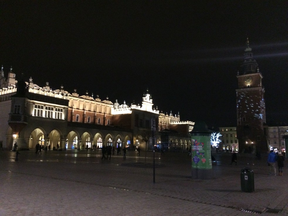 Saimos em busca do nosso jantar, mas ao anoitecer a Praça do Mercado (Rynek Glowny) estava tao encantadora com sua iluminação de Natal e as carruagens para cima e para baixo que nos deixamos ficar ali por uns instantes admirando o vai e vem da noite croata.