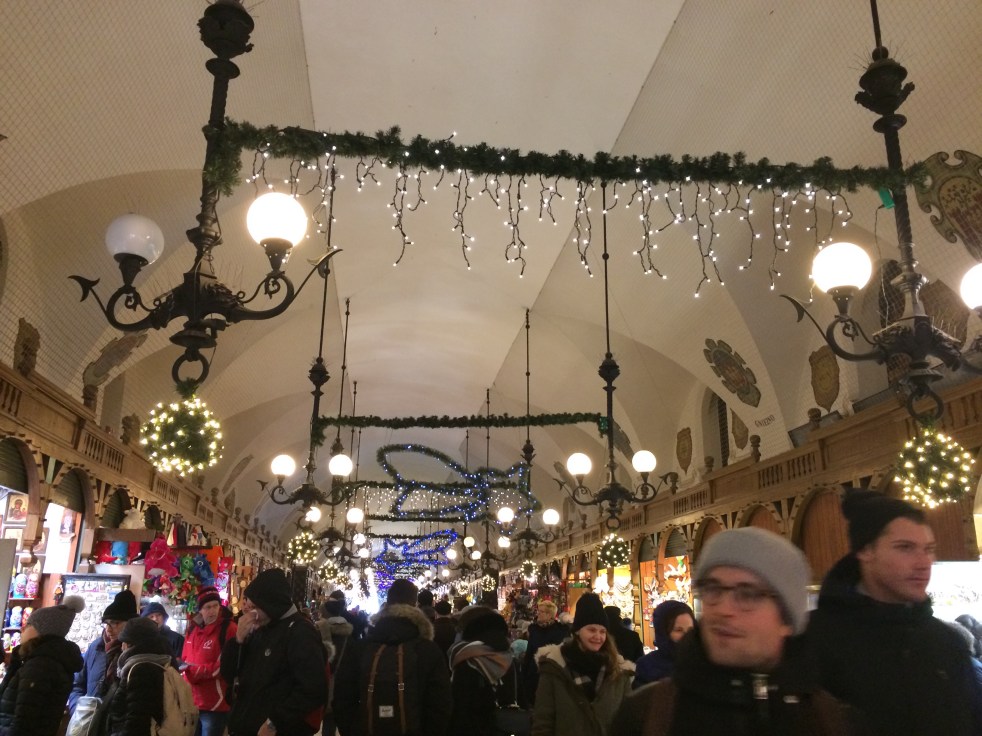 Ao fundo está o prédio da Sukiennice, um antigo centro de comércio que existe desde o século XIV. Por sorte, na época que fomos, dentro também estava acontecendo um mercado de Natal com várias lojinhas de enfeites.