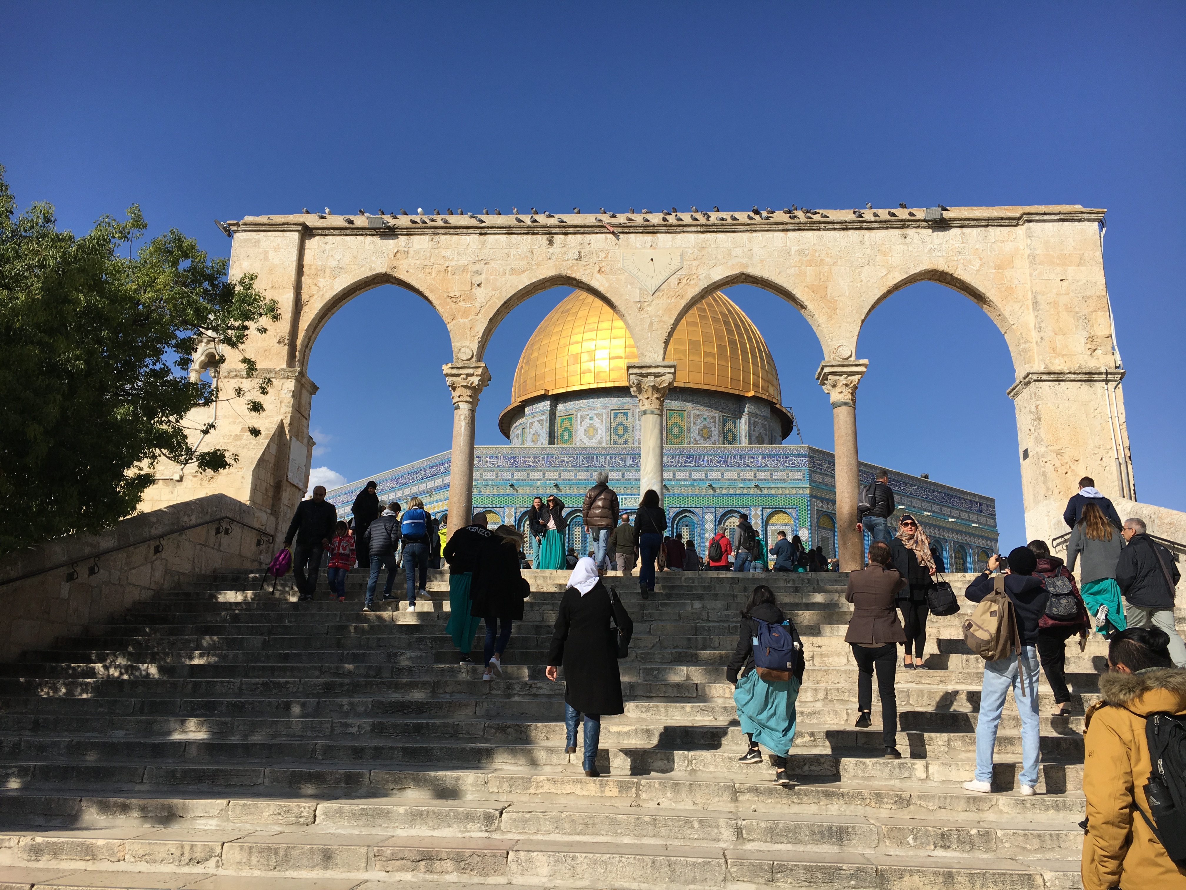 Na sequência chegamos no bairro muçulmano onde está a Esplanada das Mesquitas. Para não muçulmanos existe uma única entrada: a Bab al-Maghariba que sobe da praça em que está o Muro das Lamentaçoes. Os horários de visita são super restritos: das 7:30-10:30 e das 12:30-13:30 , quando entramos.