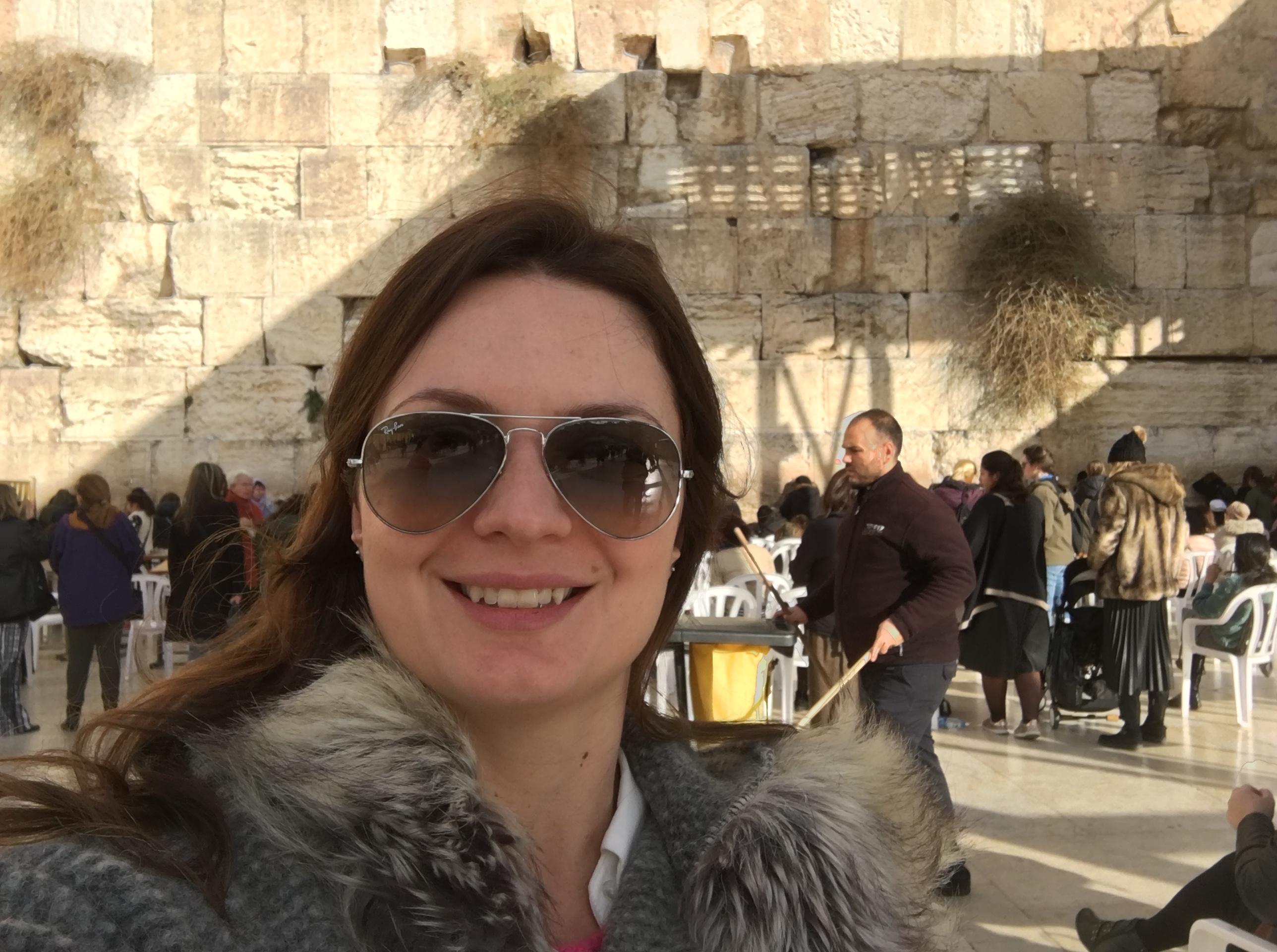 Não precisamos cobrir a cabeça e o Rogério não teve que usar o kipá e notamos que os judeus saem do local de costas. Aliás, nosso guia nos explicou que o kipá é usado pelos judeus dentro de lugares sagrados como os templos e sinagogas, mas como Jerusalém é considerada um lugar sagrado, eles acabam usando o kipá na cidade toda, durante todo o tempo.