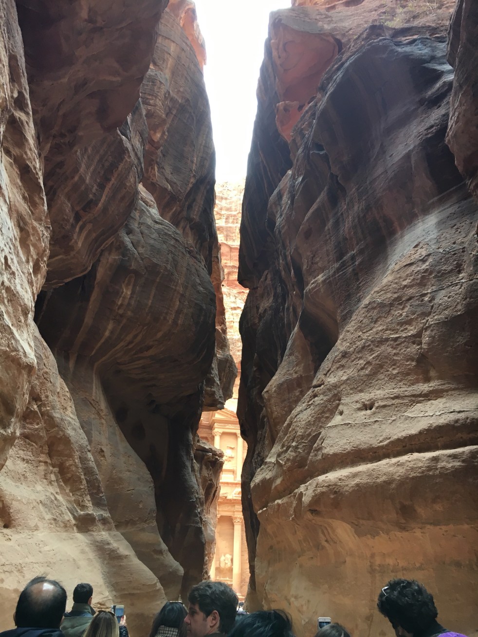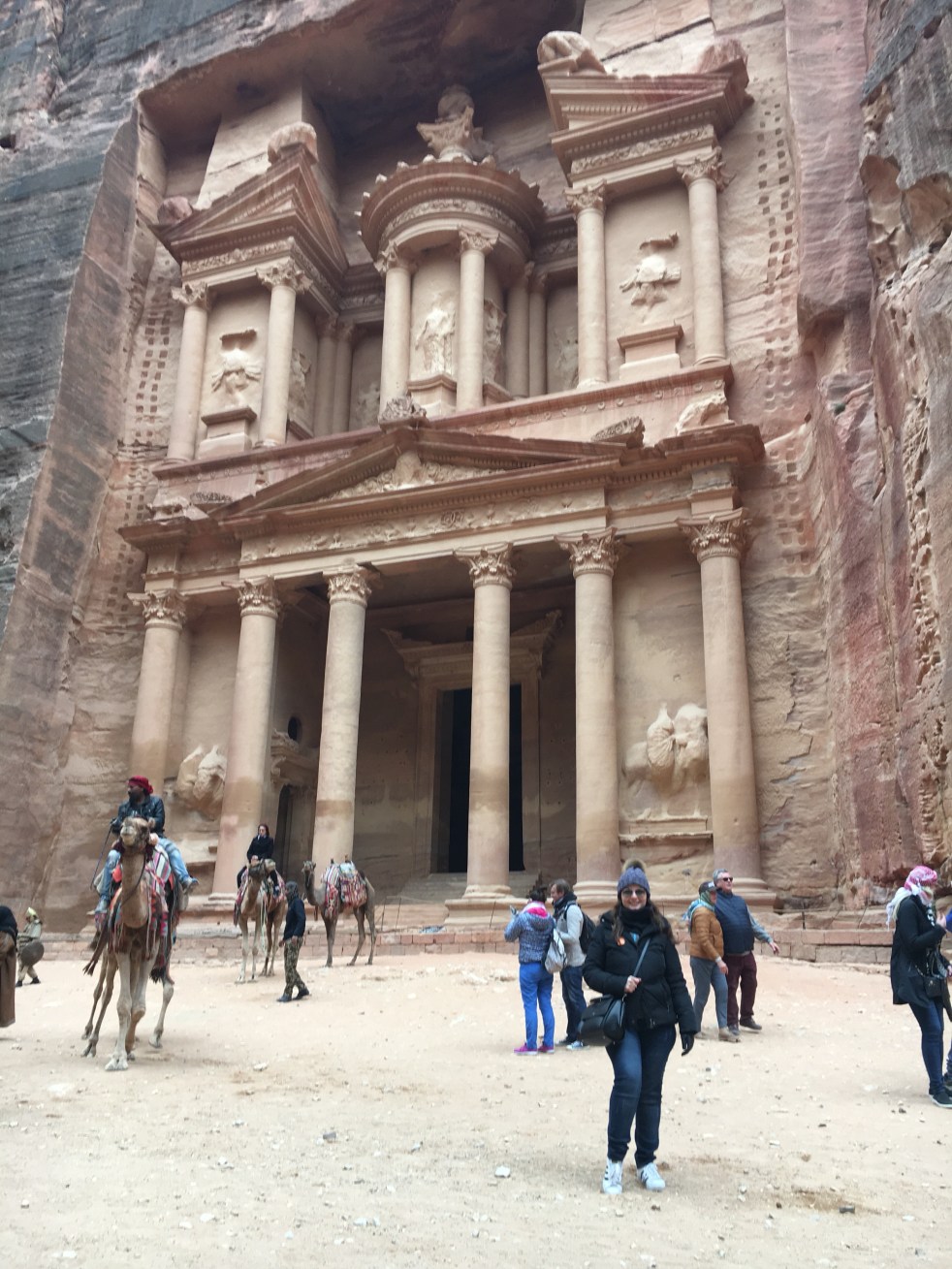 A contruçao mais famosa é a chamada “Tesouro” e é a primeira imagem que temos da cidade depois de atravessar longos metros entre corredores abertos entre as montanhas que formam uma espécie de cânion chamado “The Siq“.