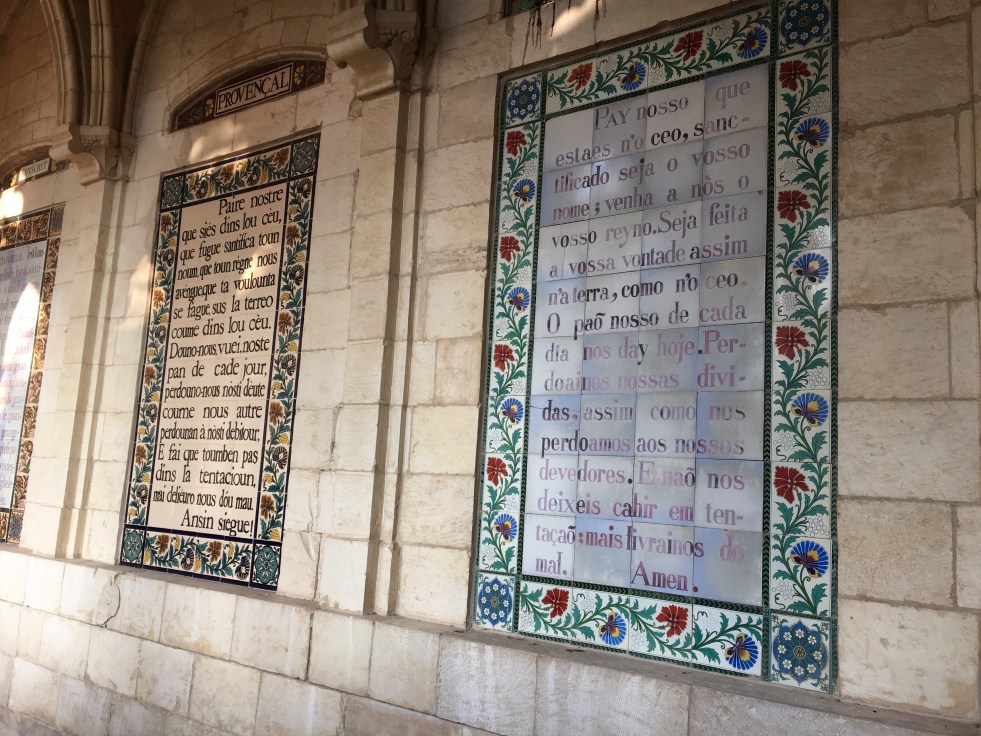 Como homenagem ao lugar, na sua parte nova foram levantados muros coberos pela oraçao do Pai Nosso na língua da maioria dos países do mundo.