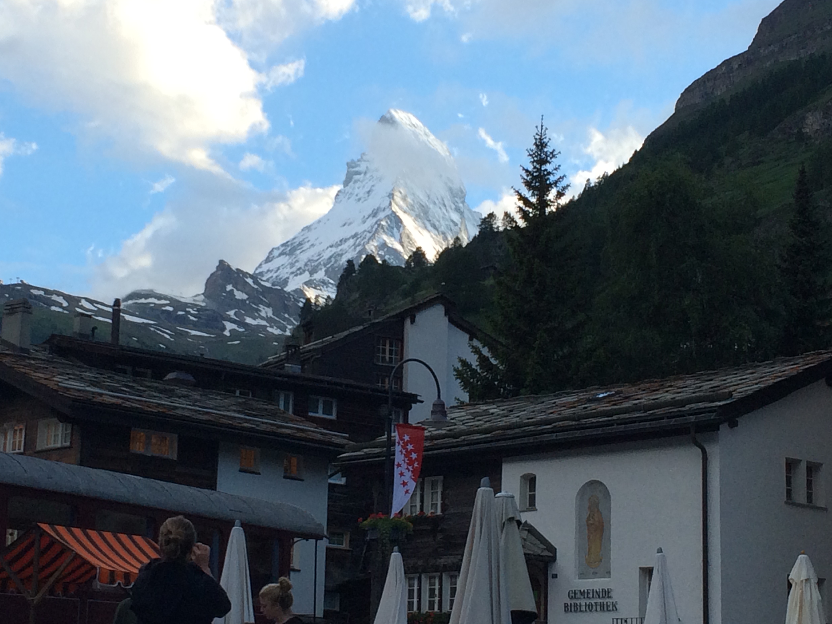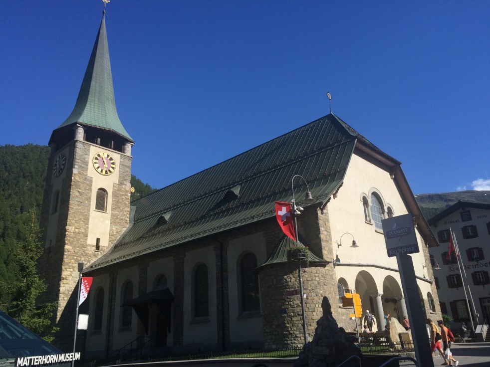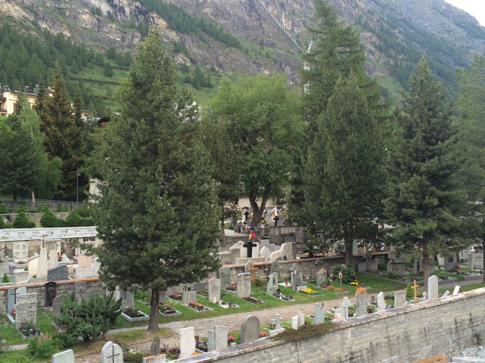 Atrás da praça está o cemitério onde estão enterrados mais de 500 alpinistas que não sobreviveram à escalada do Matternhorn.