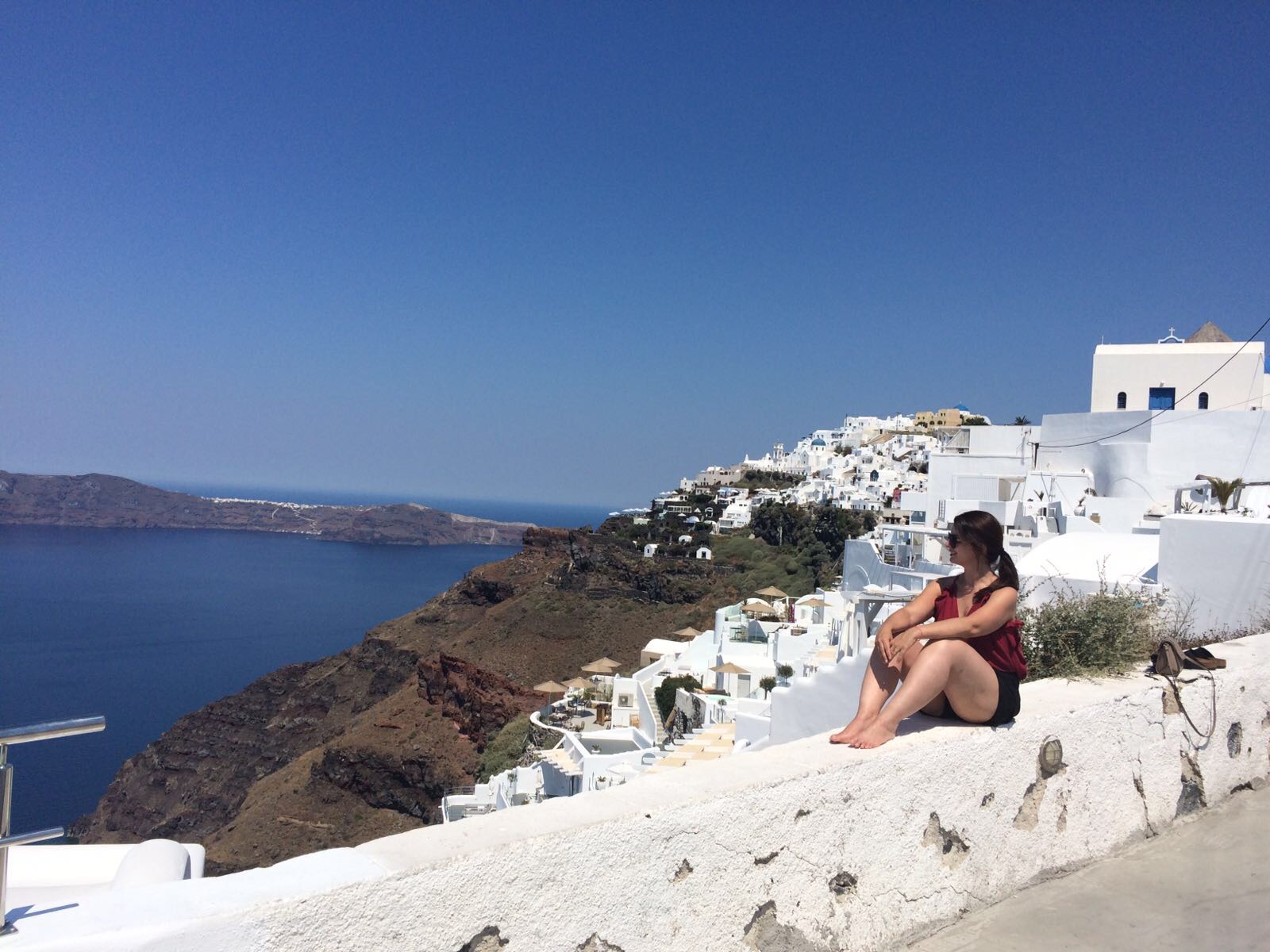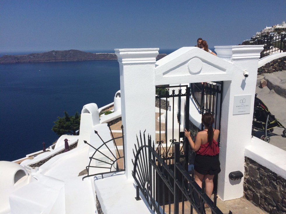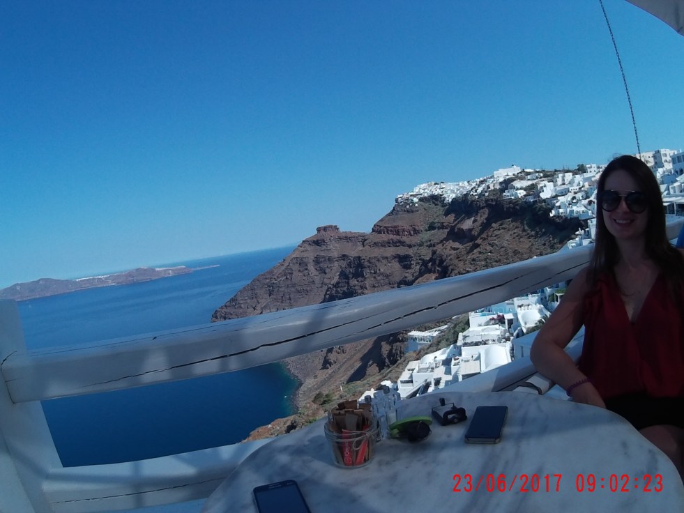 Chegamos à uma pracinha encantadora com vista para a caldeira e onde fica uma das principais igrejas de Oia, a Panagia Platsani.