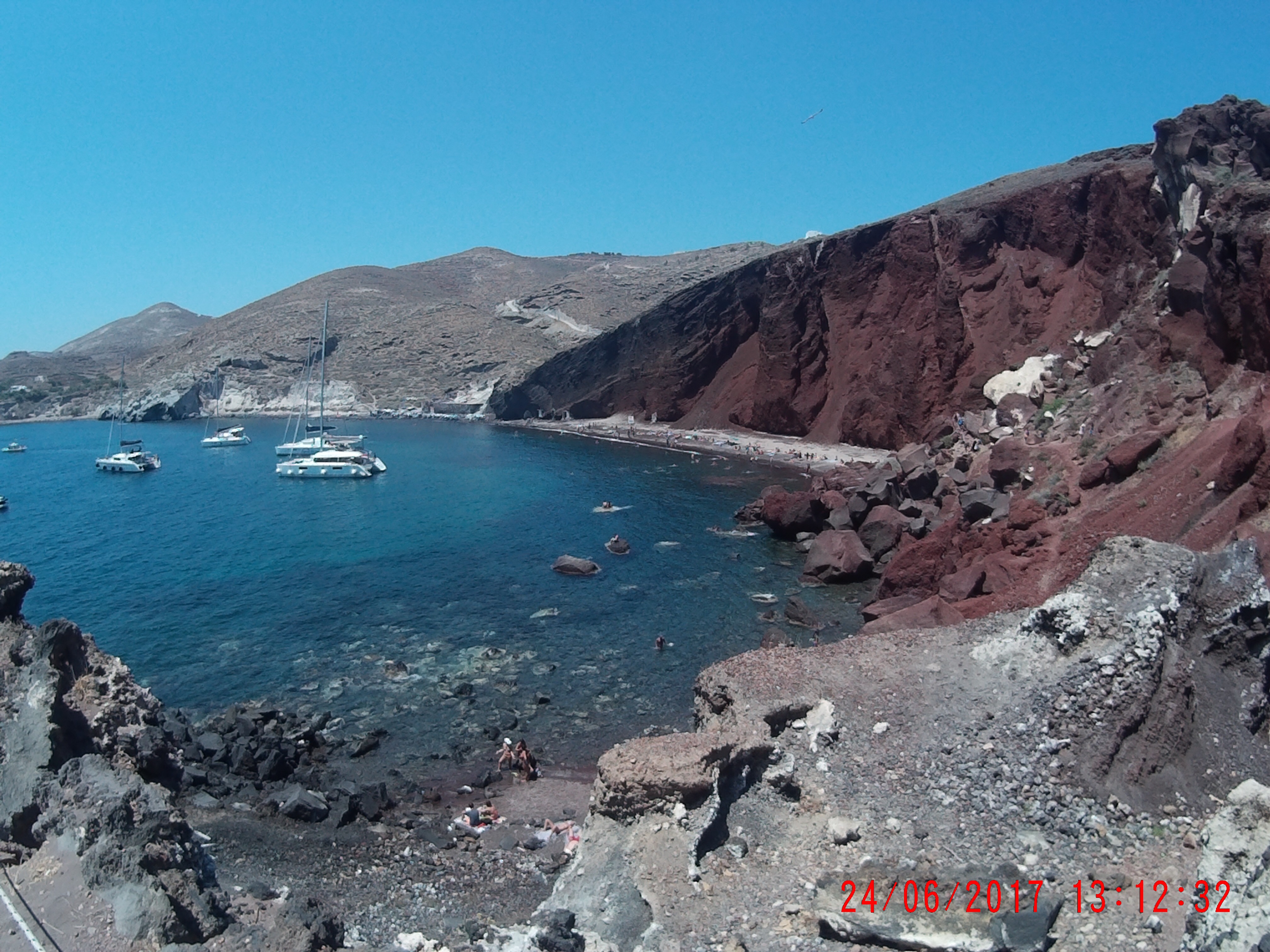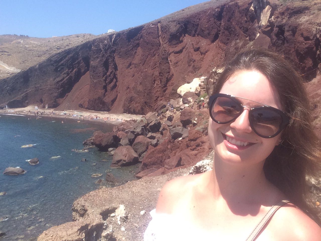 As praias de Santorini estão localizadas na parte sul da ilha e para ser sincera, não são das mais bonitas. Como a ilha é vulcânica as praias são todas de pedras, classificadas conforme suas cores: negras, bracas e vermelhas.