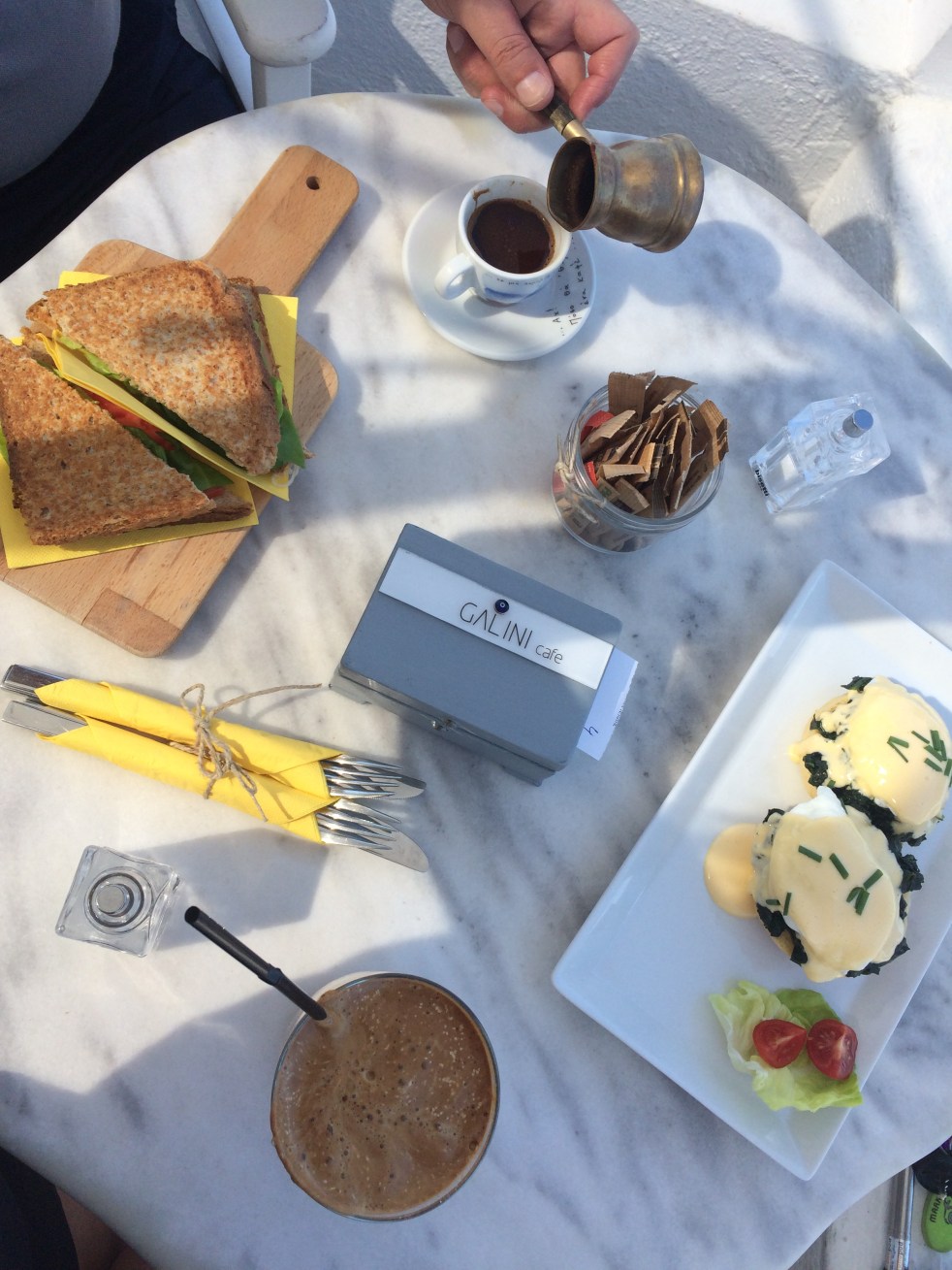 Quase ao final da trilha há uma pracinha onde tomamos nosso primeiro café da manha com vista no Café Galini, vale a pena! A vista e a comida.