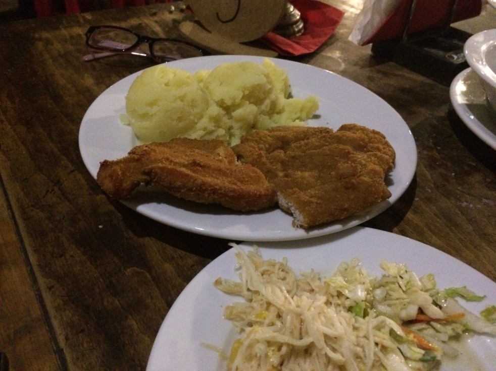 O Schnitzel, que é um bife bem fininho a milanesa, aqui é de porco, e também vale a pena. As almôndegas também são deliciosas. uase todos os pratos vem acompanhados de um puré de batatas delicioso temperado com endro.