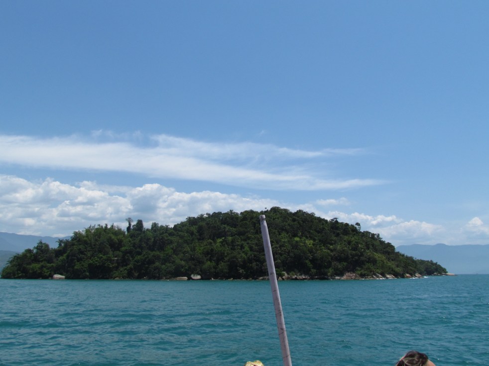 Nossa primeira parada foi na Ilha Comprida, o lugar que eu mais queria conhecer. A ilha é particular, do Naji Narras, então não se pode entrar, só mergulhar.