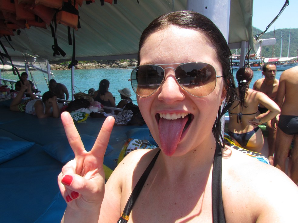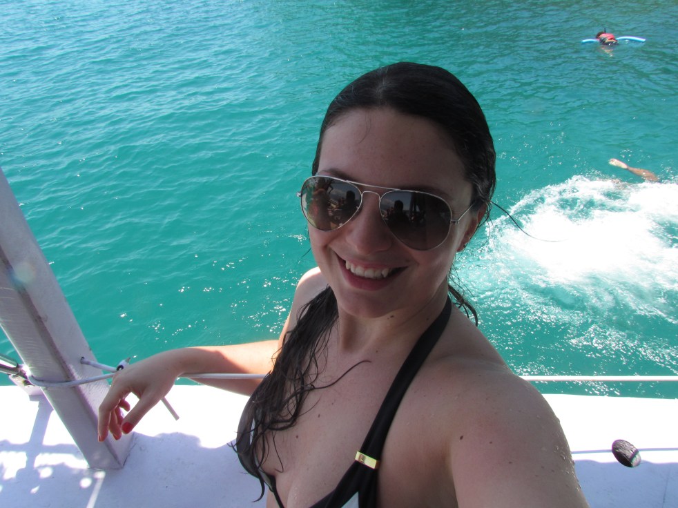 Ali naquela porção de águas mornas fica um verdadeiro aquário natural, cheio de peixinhos de diversas cores. Eu esqueci a minha câmera a prova d’água, então não consegui tirar fotos de baixo d’água, mas nosso skipper foi super solícito e tirou várias fotos nossas.