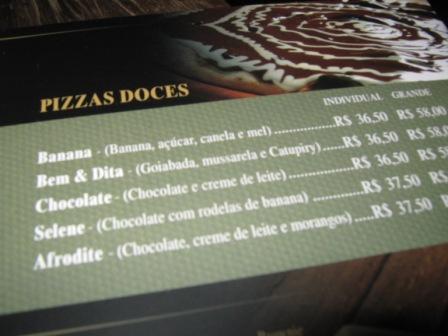 O cardápio não traz tantas variedades de pizza, mas as duas que pedimos eram muito boas. Logo que o abri fiquei feliz porque tinha uma pizza com meu nome!