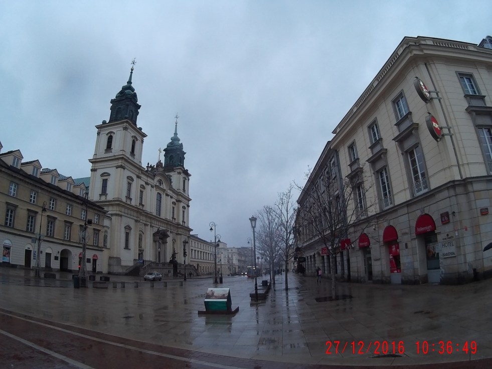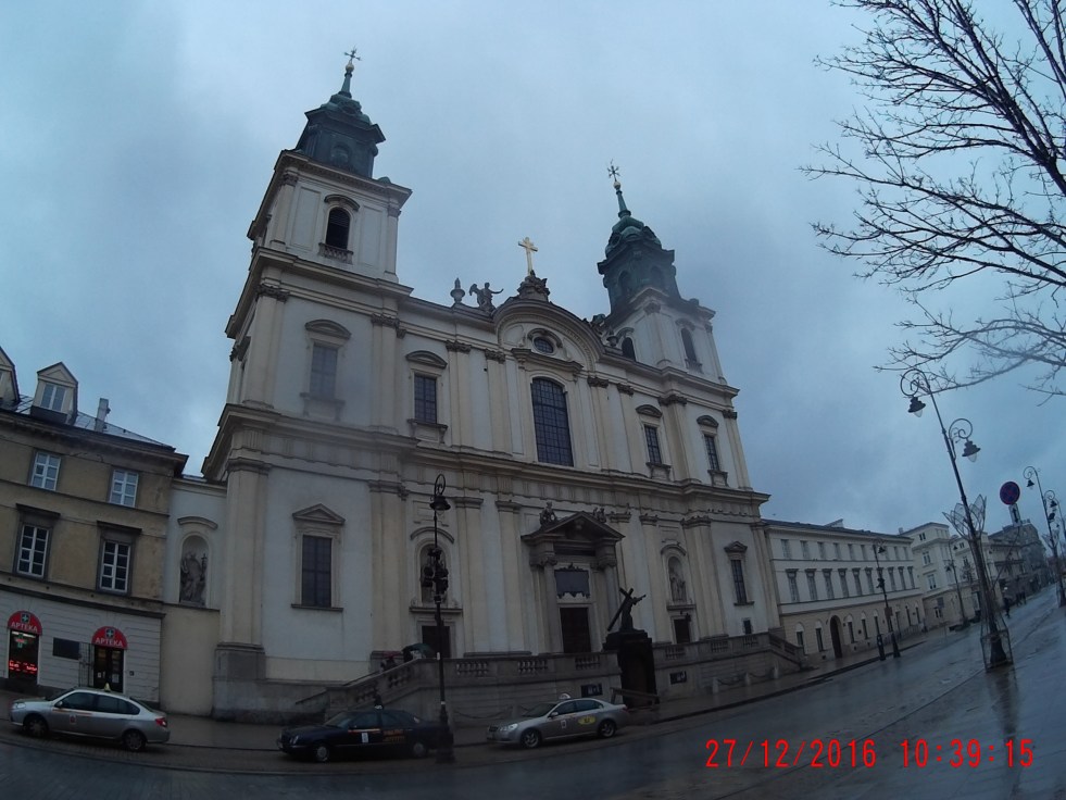 Seguindo pela mesma rua encontramos a Igreja de Santa Cruz do século XVII , toda branquinha por dentro e em cujo interior está depositada a urna que guarda o coração de Chopin, que pediu em testamento que seu coração voltasse à Varsóvia e que em seu funeral se tocasse a peça “Missa de Requiém” de Mozart.