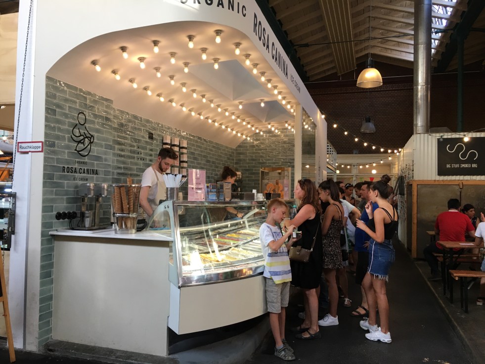 Giramos à direita na Wrangelstrasse até a altura da Eisenbahnstrasse onde fica o Markt Halle Neun uma espécie de praça de alimentações estilo truck food com comidas do mundo todo, tinha até tapioca.