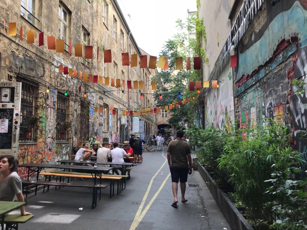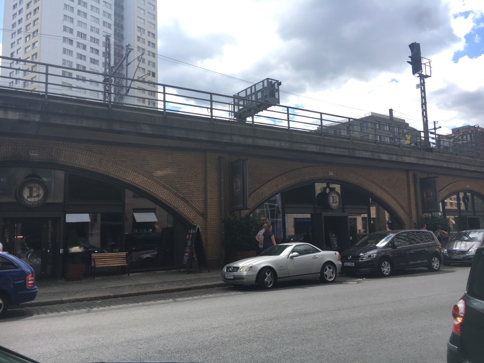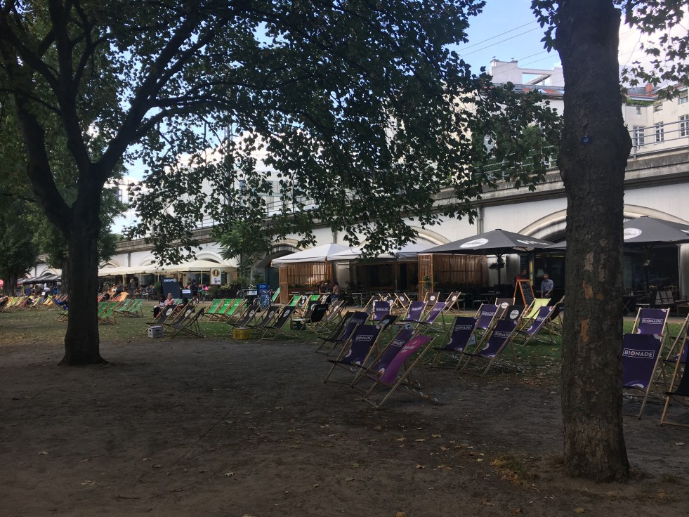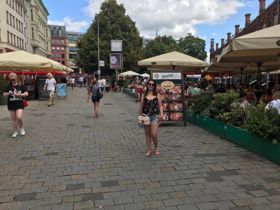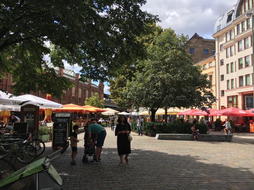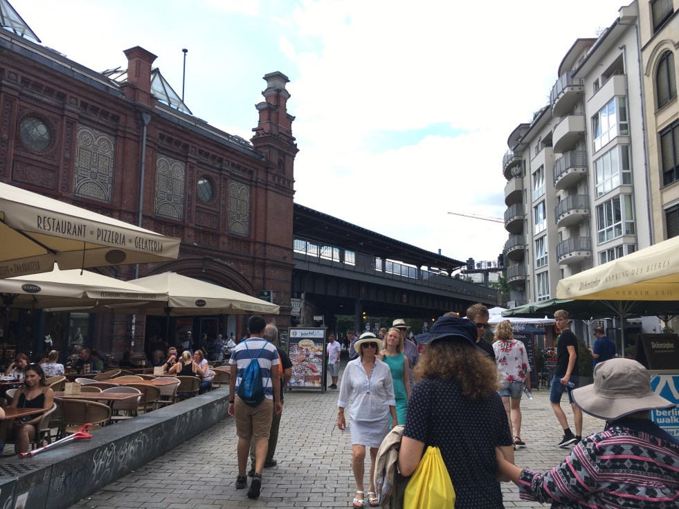 Caminhamos cerca de 800 metros até o Hackerscher Markt, outra praça na região central de Berlin, criada embaixo dos trilhos do trem, onde uma séries de restaurantes, barzinhos e birgartens se distribuem.