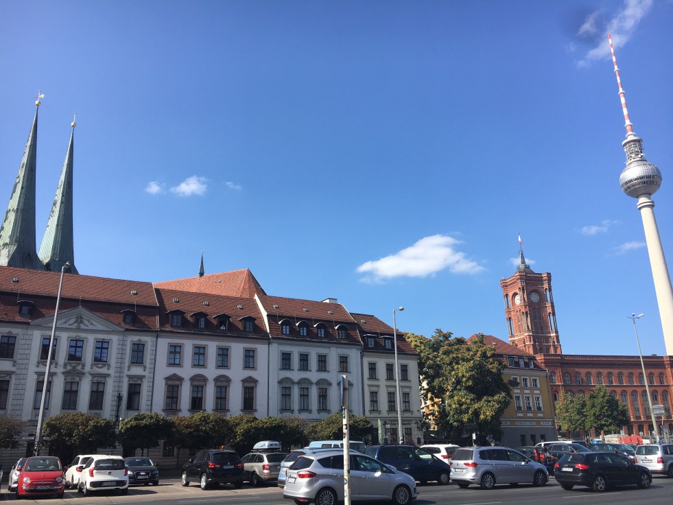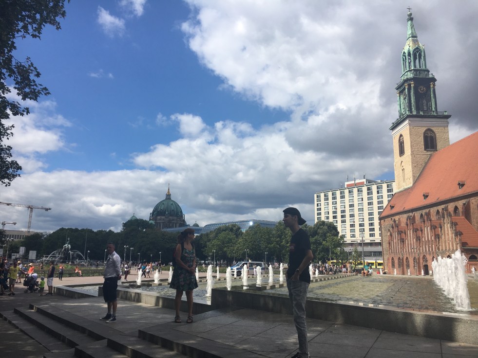 Já na parte oeste da praça esta a Marienkirche, que construída em 1380, é a Igreja Evangélica mais antiga de Berlin, a Fonte de Neptuno e o prédio da Prefeitura, a rotes Rathaus.