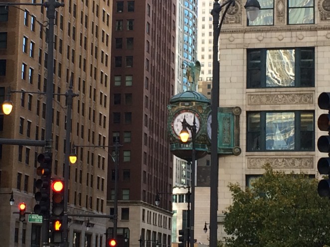 Já tomando o sentido contrário da avenida, fomos em sentido ao Lago Michigan e ao Wrigley Building. O objetivo da Magneficent Mile era unir a parte antiga da cidade (sul) com a parte nova e comercial (norte). Como o Lago Michigan se encontra a um quarteirão da Avenida foi necessário construir um nível superior para uní-las, e o acesso a essa “parte de cima” se dá por dentro do “Wrigley Building” que é o “Big Ben” de Chicago. São 51 lojas reunidas nesse prédio inspirado na Catedral de Sevilha e todo coberto por lajotinhas brancas – um charme.