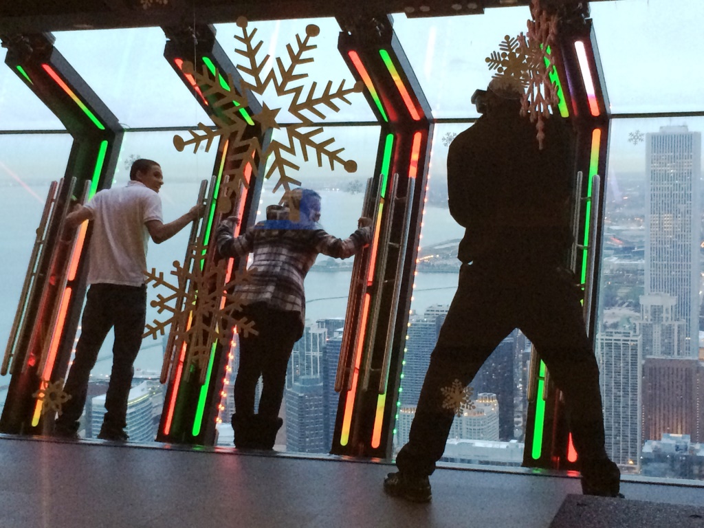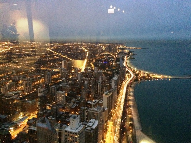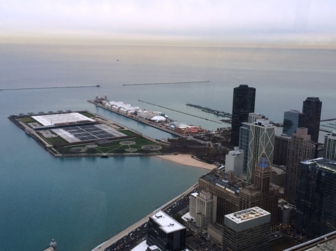 A vista lá de cima é incrível porque além da cidade também é possível ver toda a orla da cidade, o Navy Pier, o Lago Michigan e a própria Sears Towers, sua concorrente número 1, já escrevi sobre ela aqui.