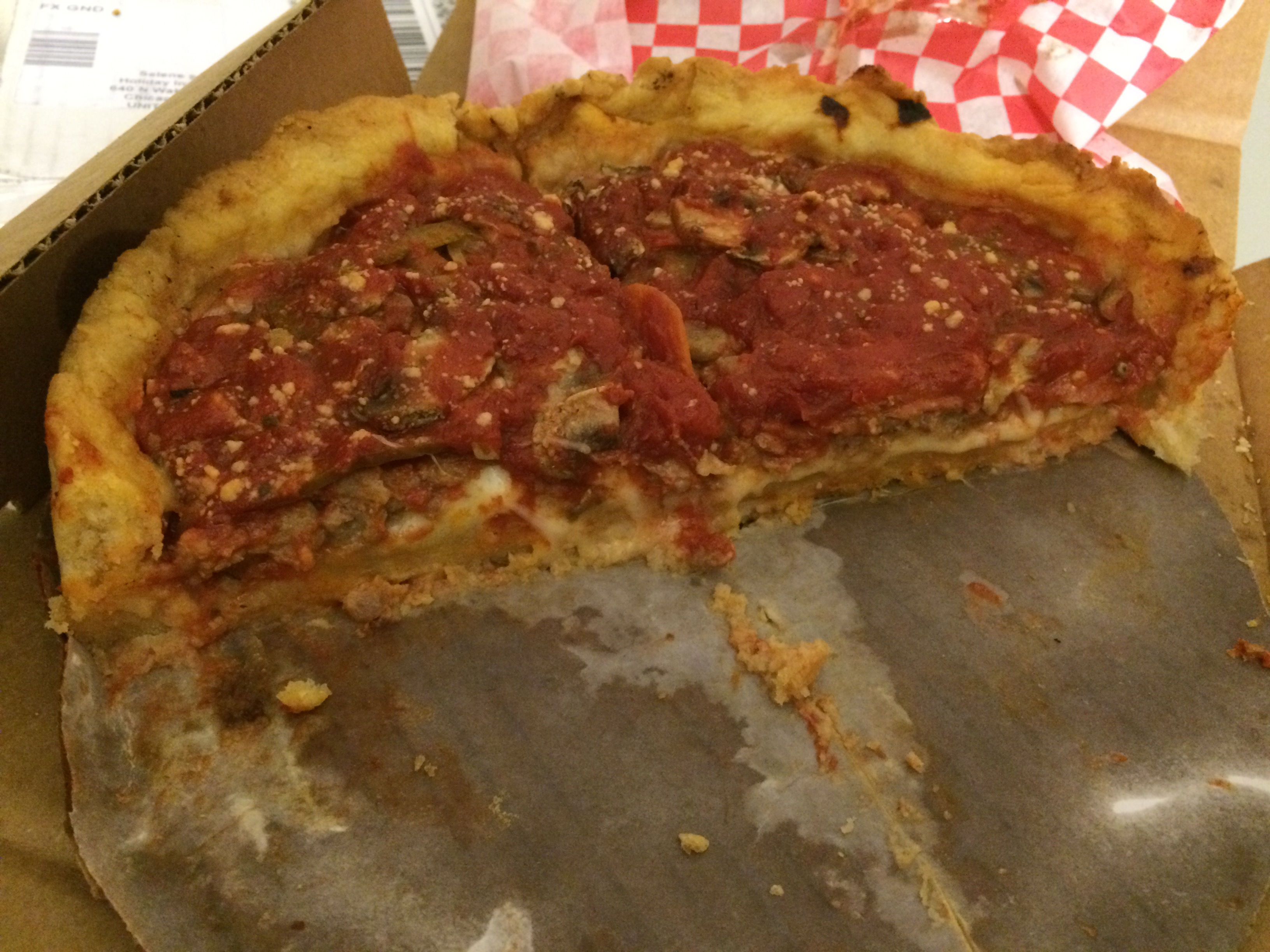 Na saída não deixe de provar a famosa pizza de Chicago, a deep dish. Ela é uma mistura de torta e pizza porque a massa é de pizza, mas colocada em uma forma de torta para que ela fique bem “funda” e caiba bastante recheio. Há diferentes recheios como vegetais, peperoni, queijo etc. Nós pedimos a de queijo com molho de tomate e estava incrível!