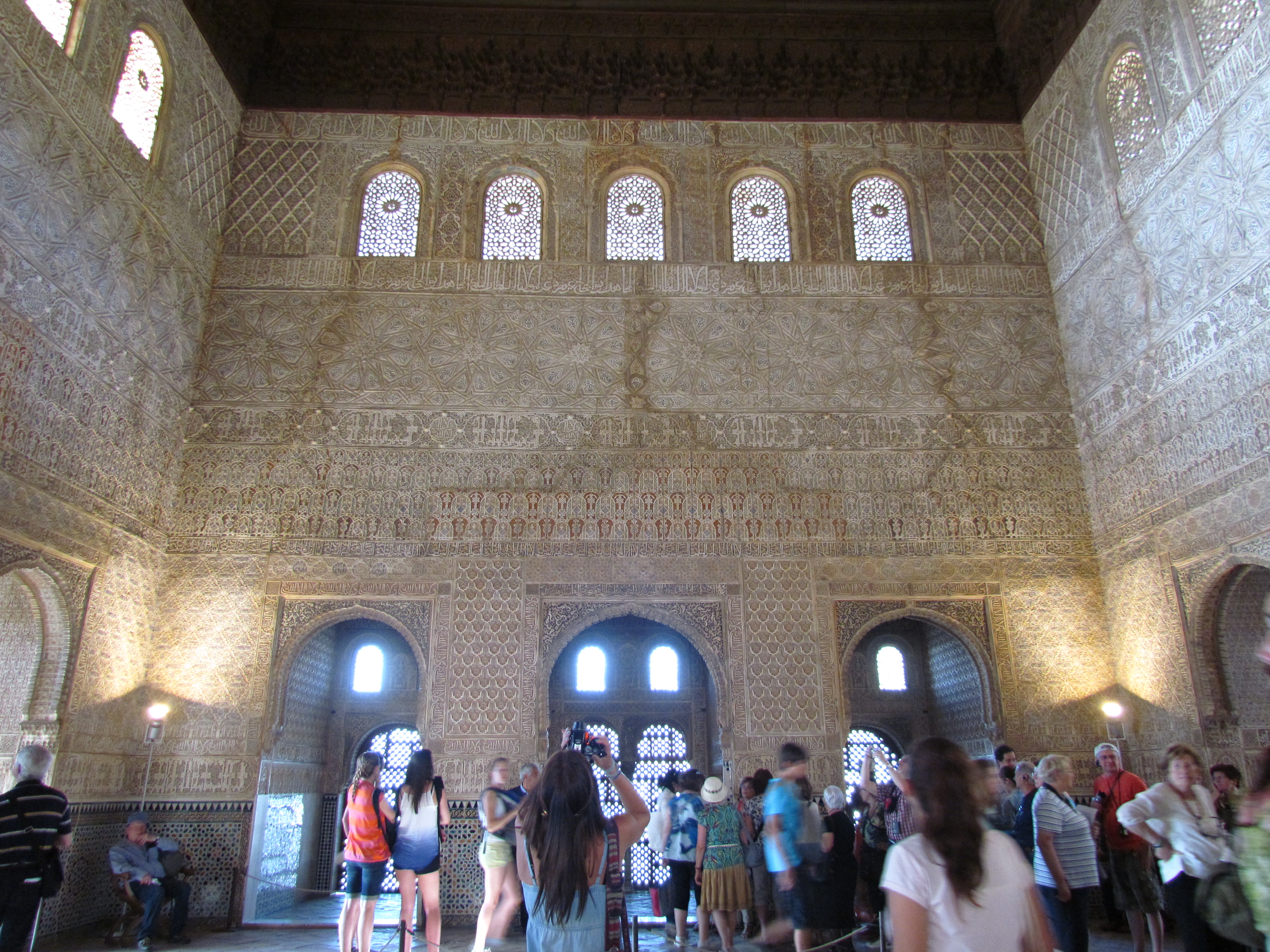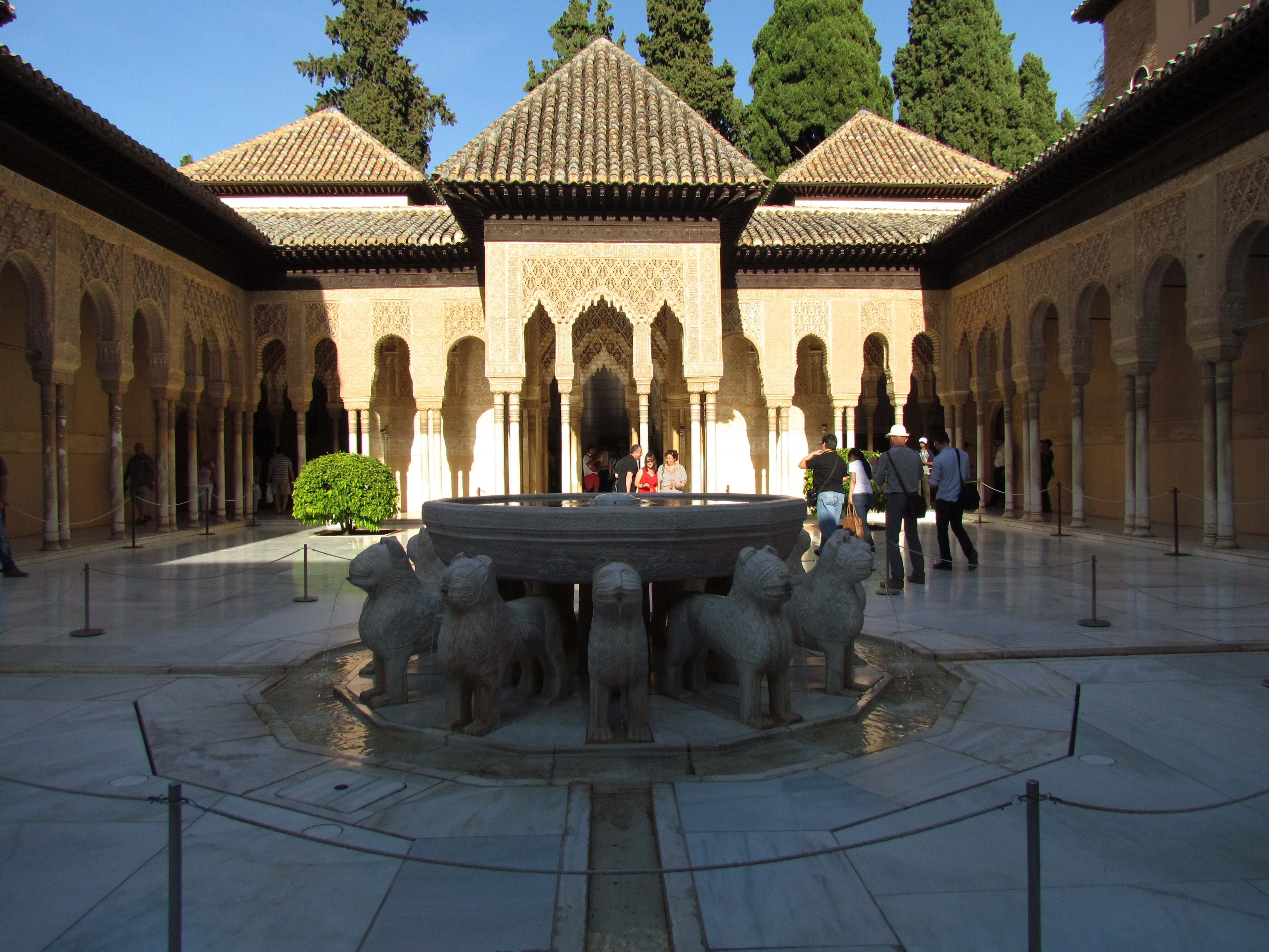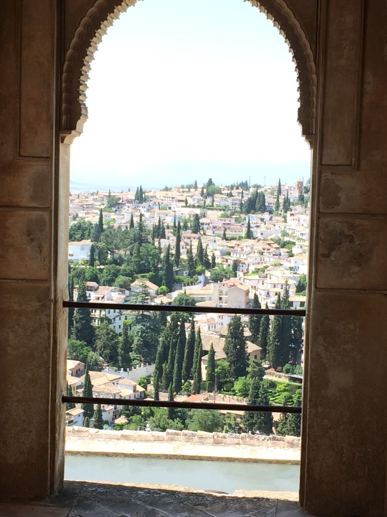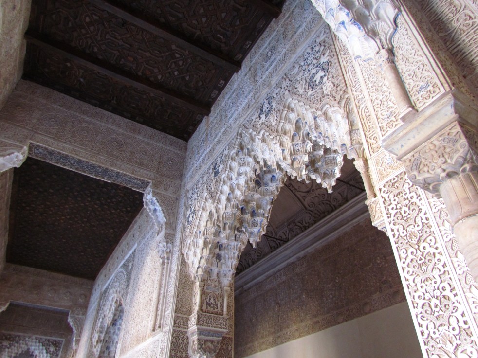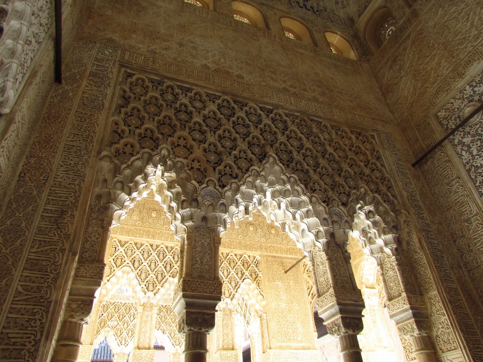 Em seguida chegou nosso horário para a visita. Pegamos uma pequena fila e entramos nos Palácios Nasrid, a residência dos reis de Granada, construídos no século XIII. Três palácios formam o complexo: Mexuar, Comares ou Palácio Yusuf I e Palácio de los Leones. Os pátios, jardins, paredes e adornos refletem aspectos da cultura Persa e Muçulmana. Lagos e jardins contornam os castelos assim como as fontes de mármore.