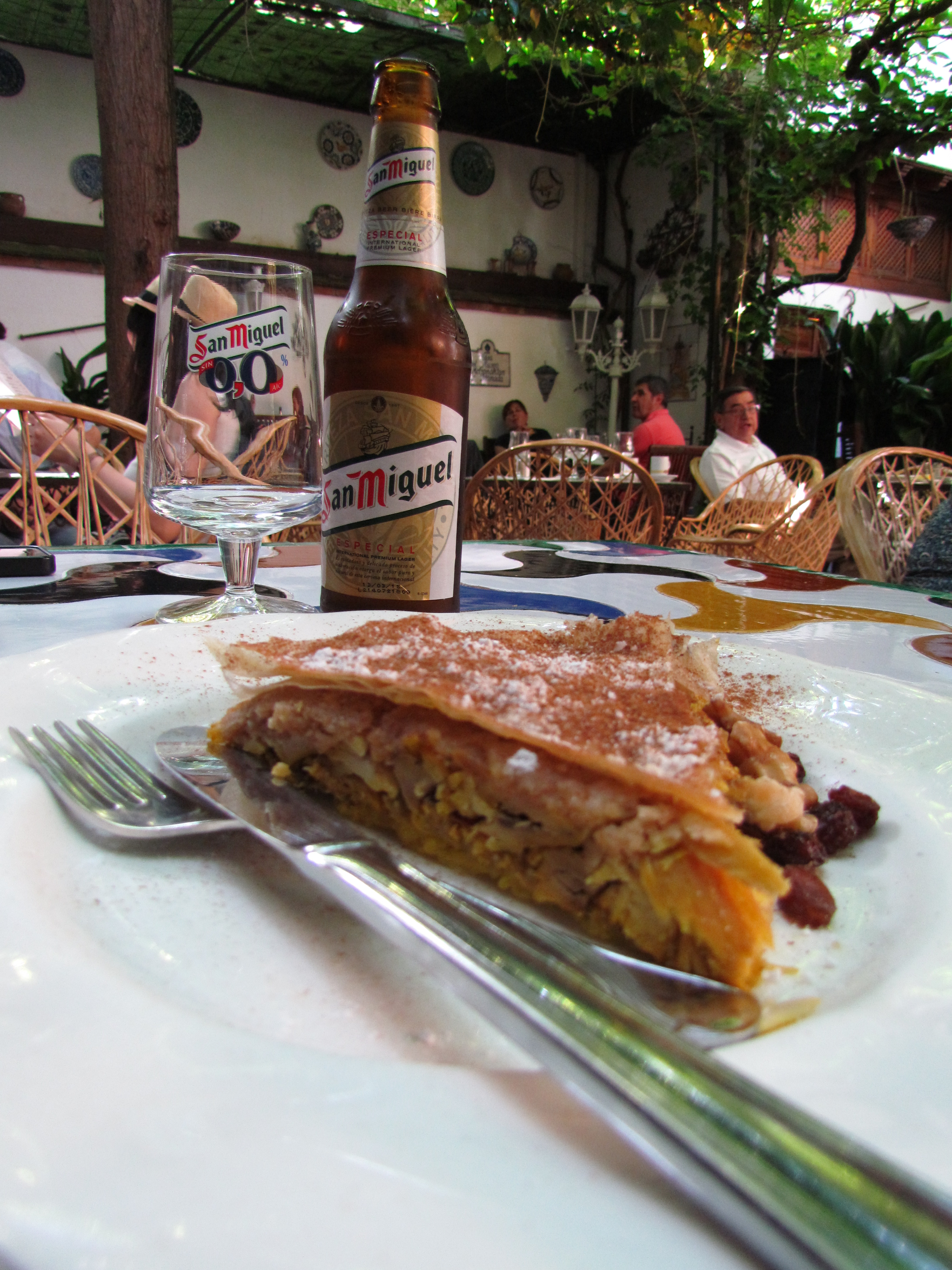 Como ainda faltava tempo para a entrada nos Palácios Nasrid fomos até o bar do Hotel America Granada tomar um ‘tinto de verano’ e provar a famosa pastilla árabe, uma massa folhada finíssima recheada com frango, maçãs, canela e amêndoas – uma delícia!!