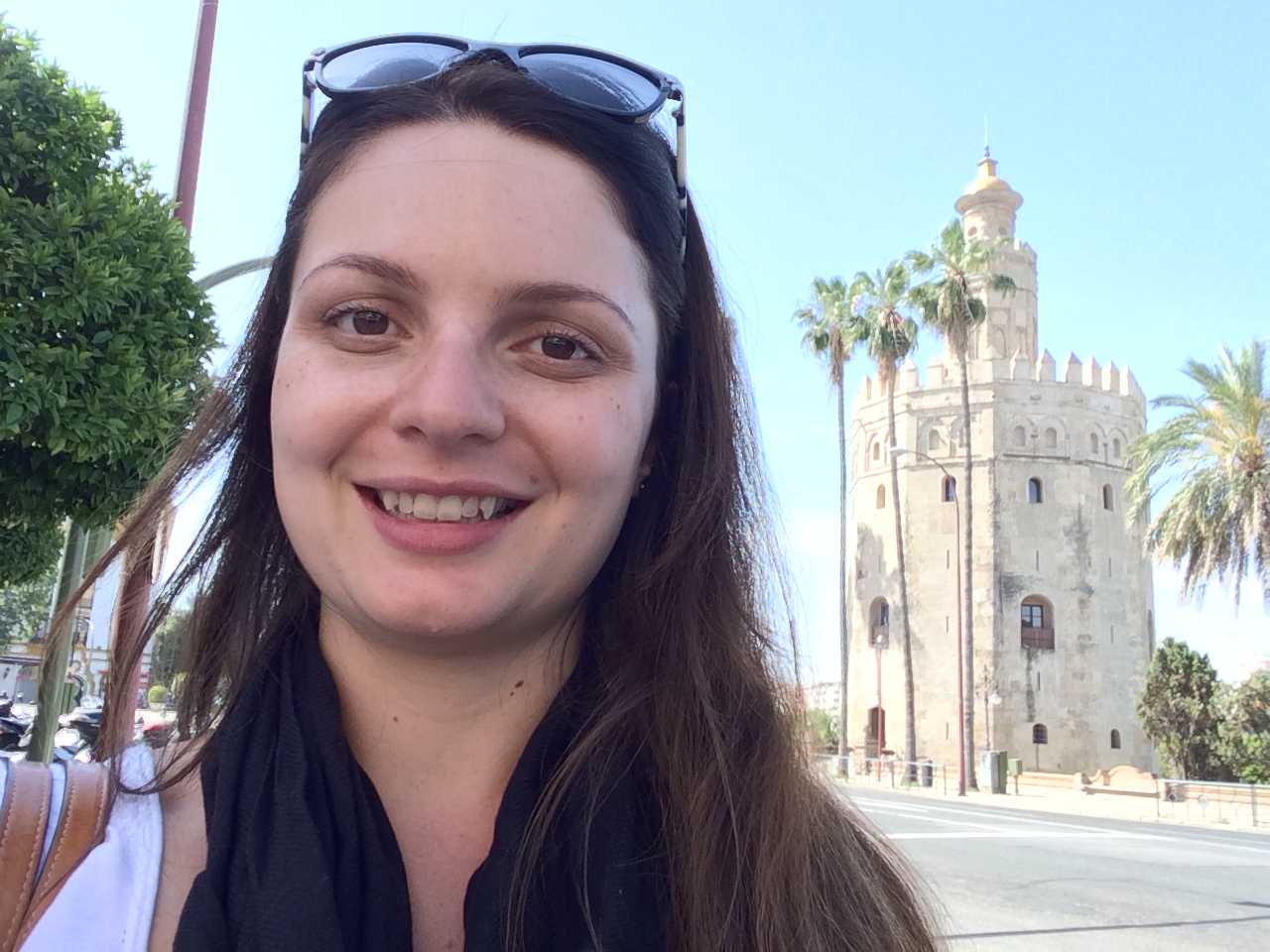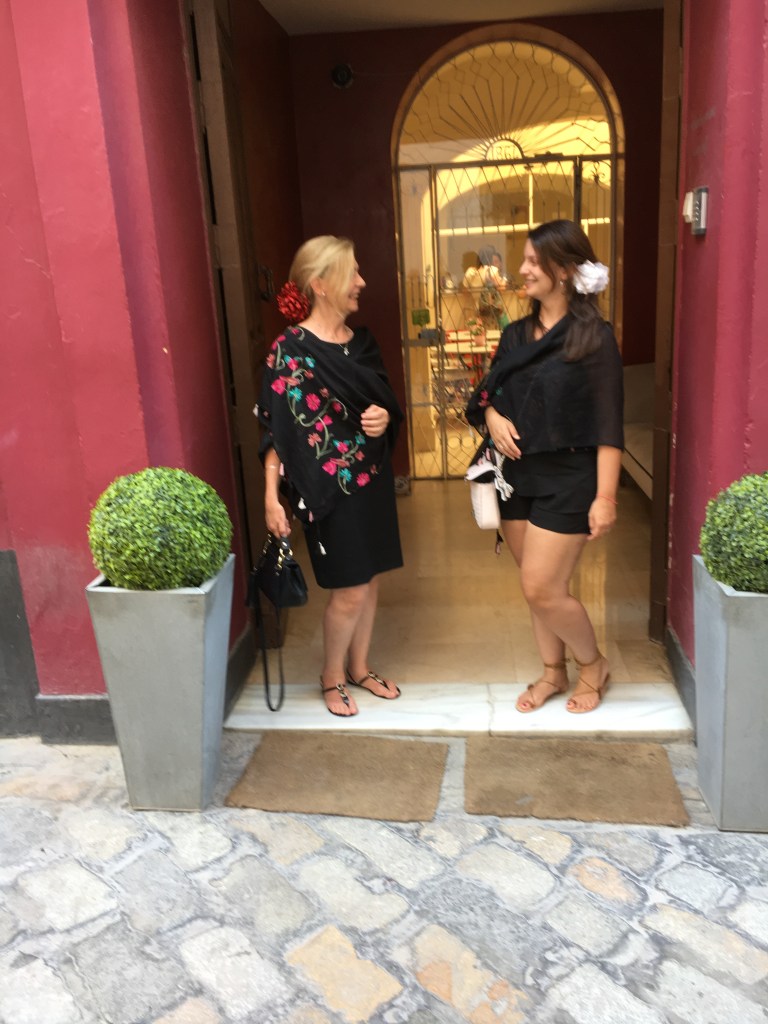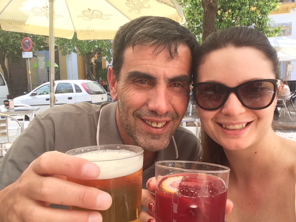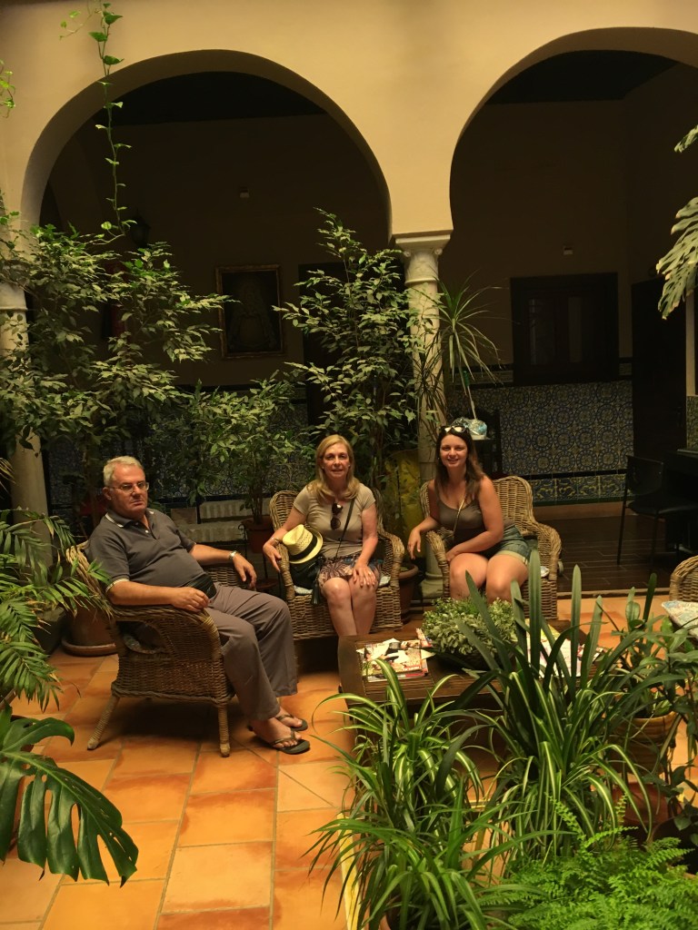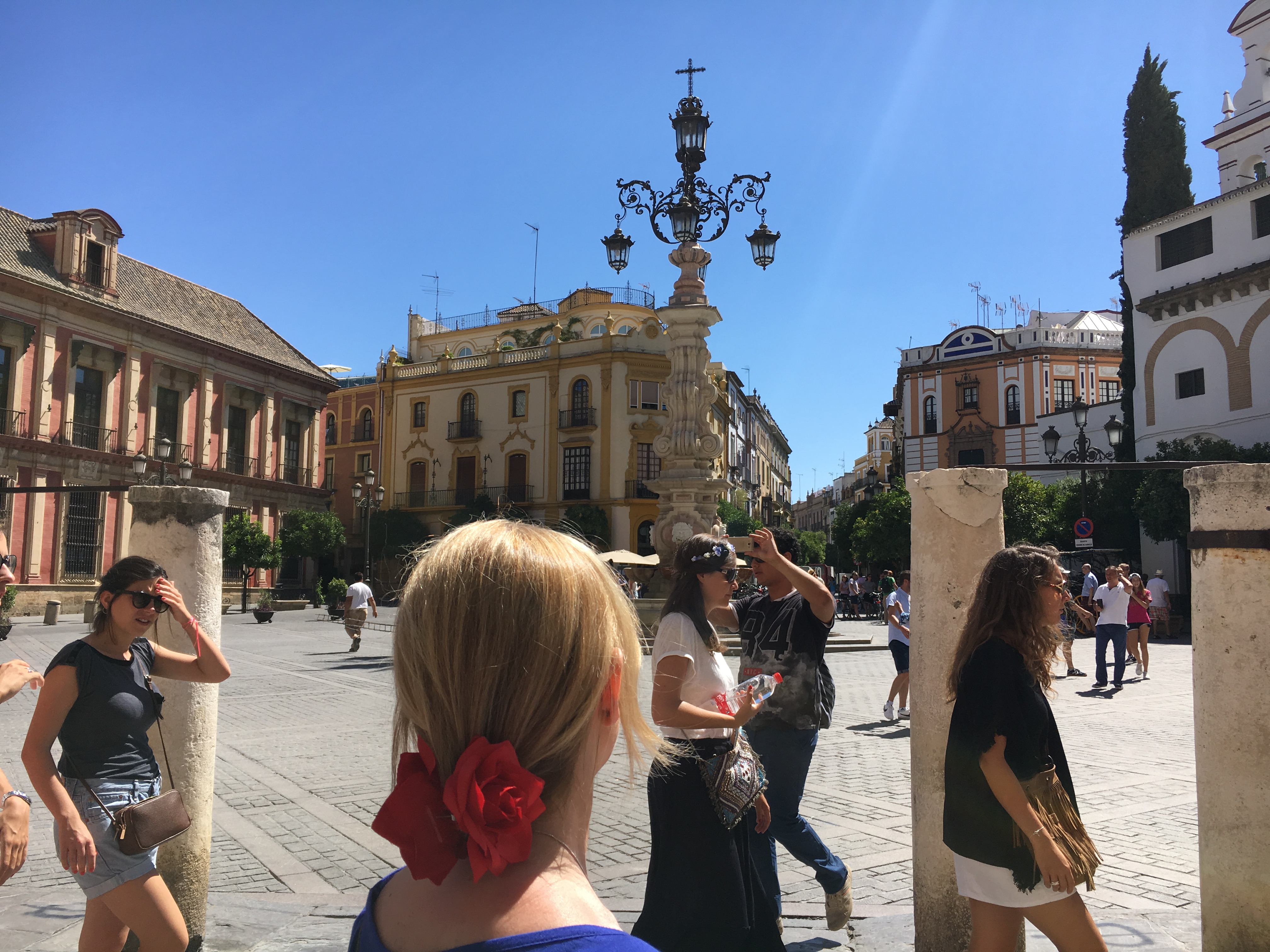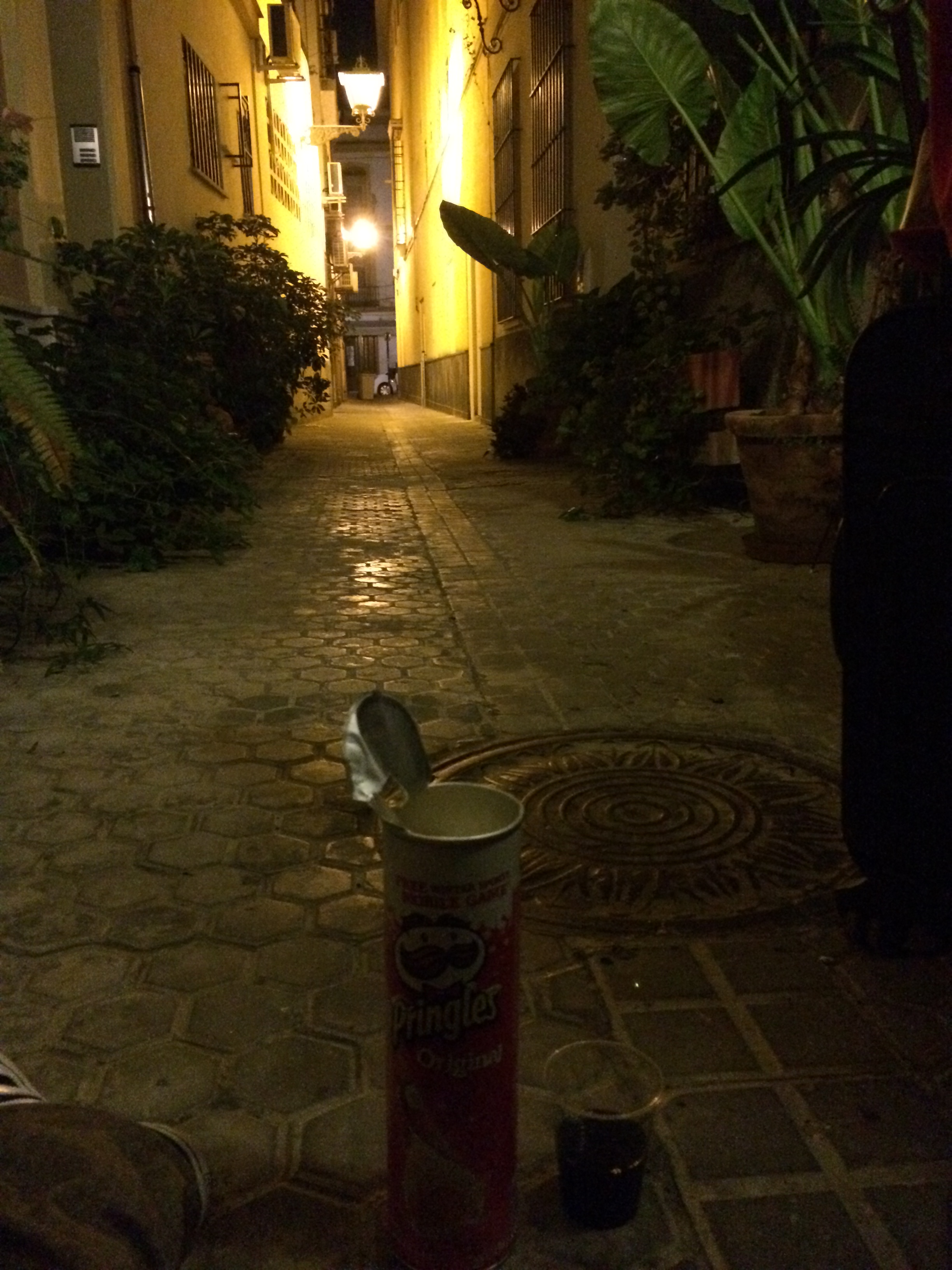 Assim que chegamos em Sevilha ainda estava um pouco escuro e tudo fechado. Fomos para o nosso hotel que também ainda não estava aberto, mas ficava em uma viela super tranquila e charmosa. Ficamos lá sentados tomando vinho e comendo batatas Pringle! Uma recordaçao muito divertida da viagem.