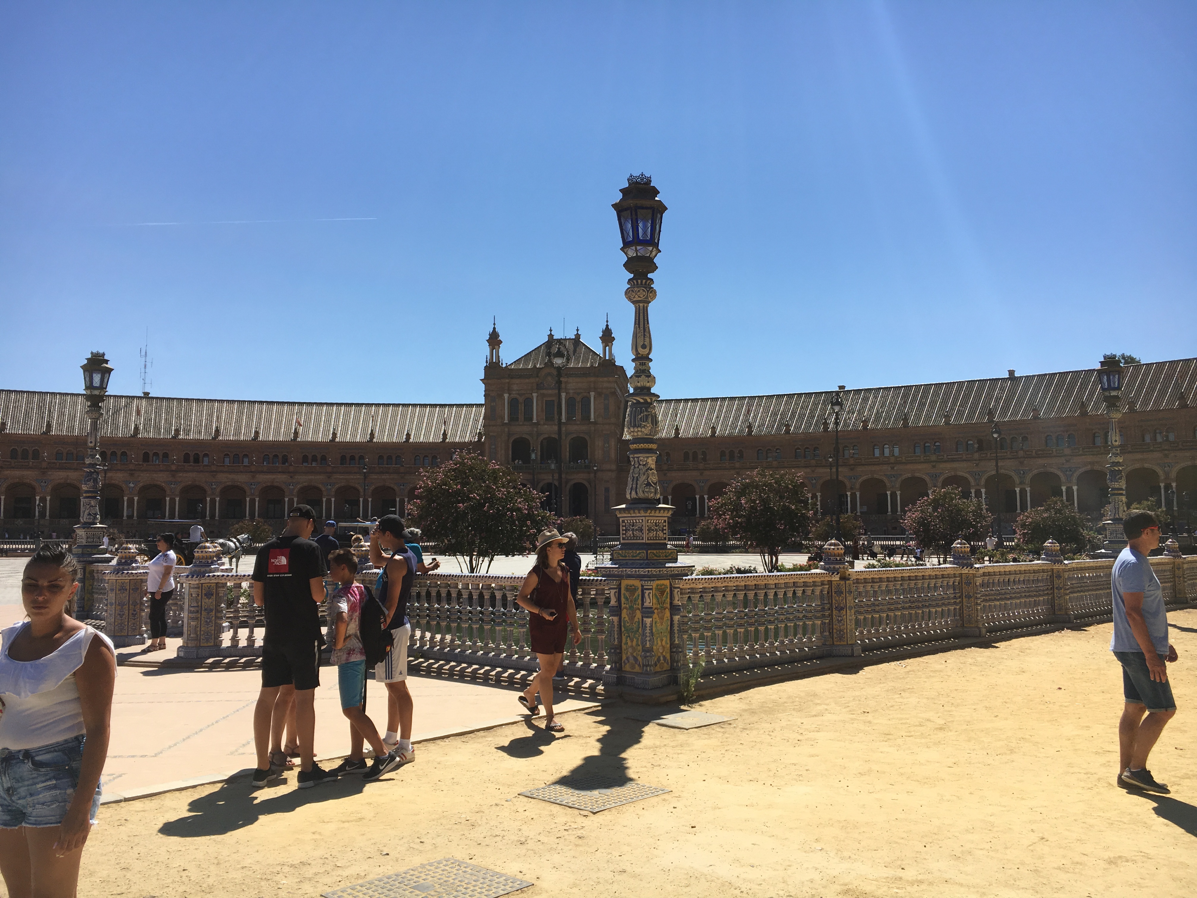 Seguindo pela Avenida de la Constituición chega-se à Praça España e ao Parque de Maria Luisa, o lugar ideal para descansar depois de andar debaixo de um sol super forte! Sim! Sevilha é realmente muito quente e pegamos 43ºC em plena Primavera!