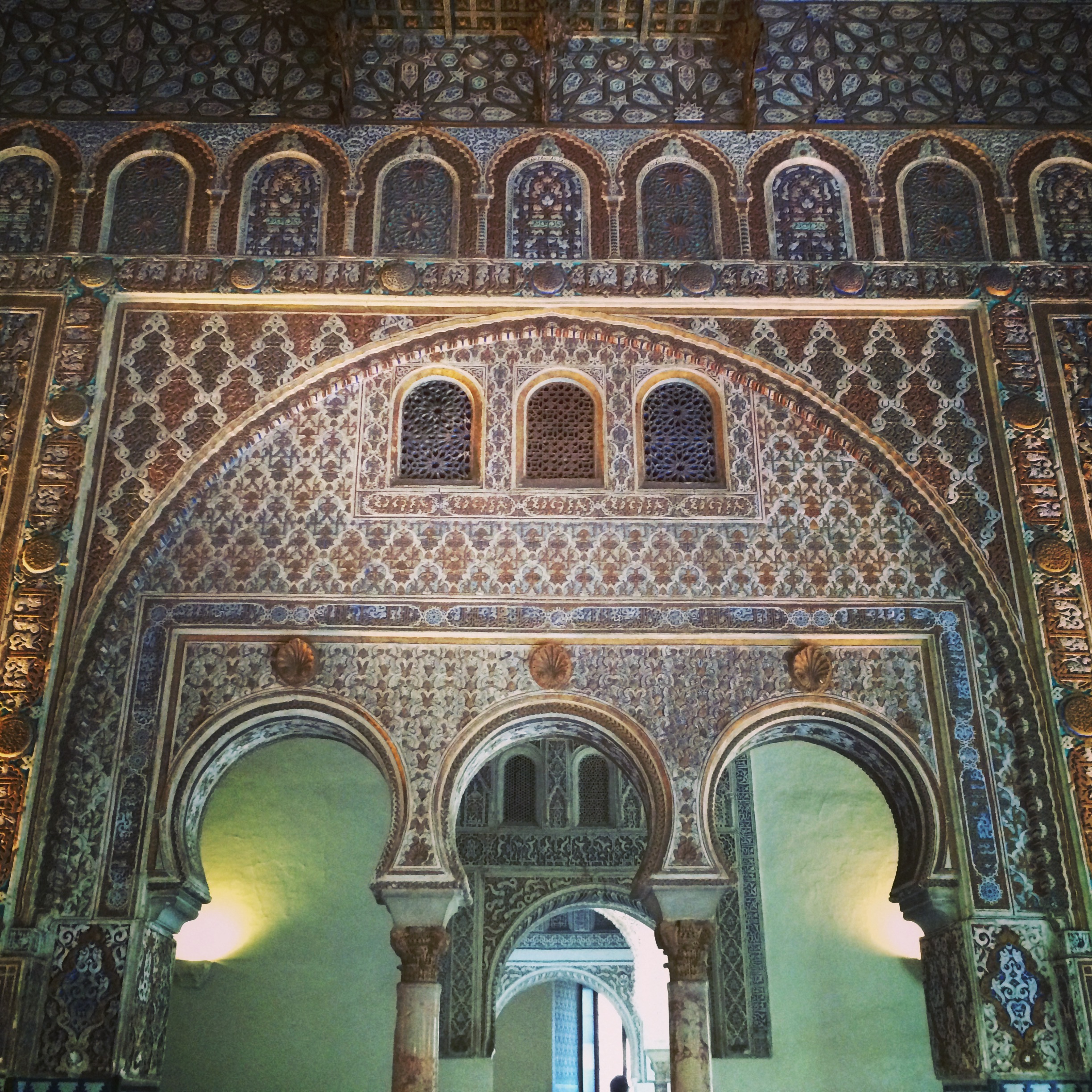 O seu aspecto atual se deu depois da conquista de Sevilha, em 713, pelos árabes; estes utilizaram os alcáceres como residência dos seus líderes a partir de 720. Em 884, a fortaleza contribuiu para evitar a invasão da cidade pelos vikings. Um dos palácios é da mesma idade de um dos palácios da Alhambra.