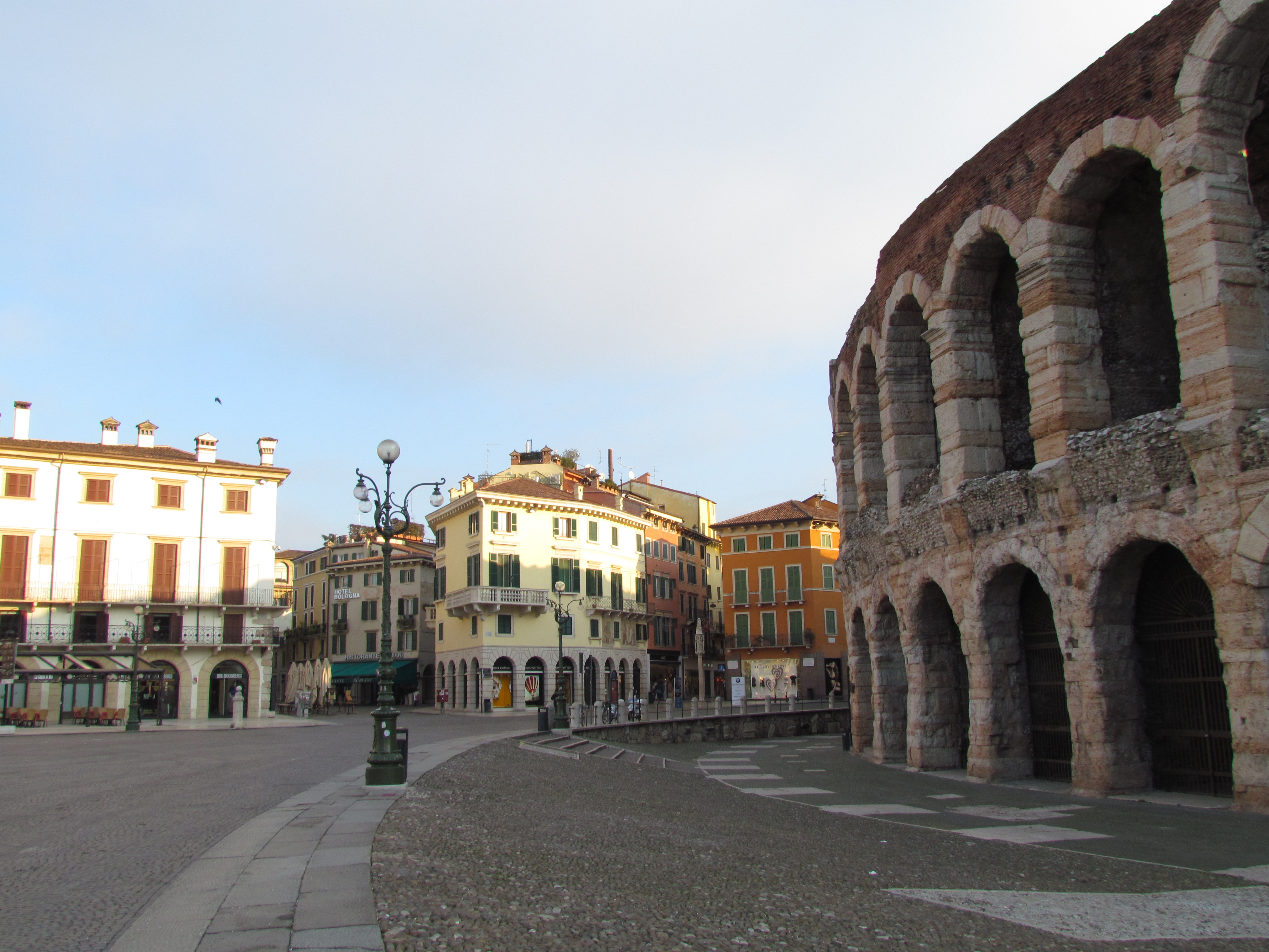 Chegamos bem cedo, por volta das 7, e a cidade ainda estava meio vazia. Fomos direto para a Praça Bra onde fica a Arena di Verona e aproveitamos para tirar milhares de fotos sem ninguém na frente. A Arena é um coliseu onde hoje acontecem diversos shows e, na época de verão, a temporada de Ópera de Verona.
