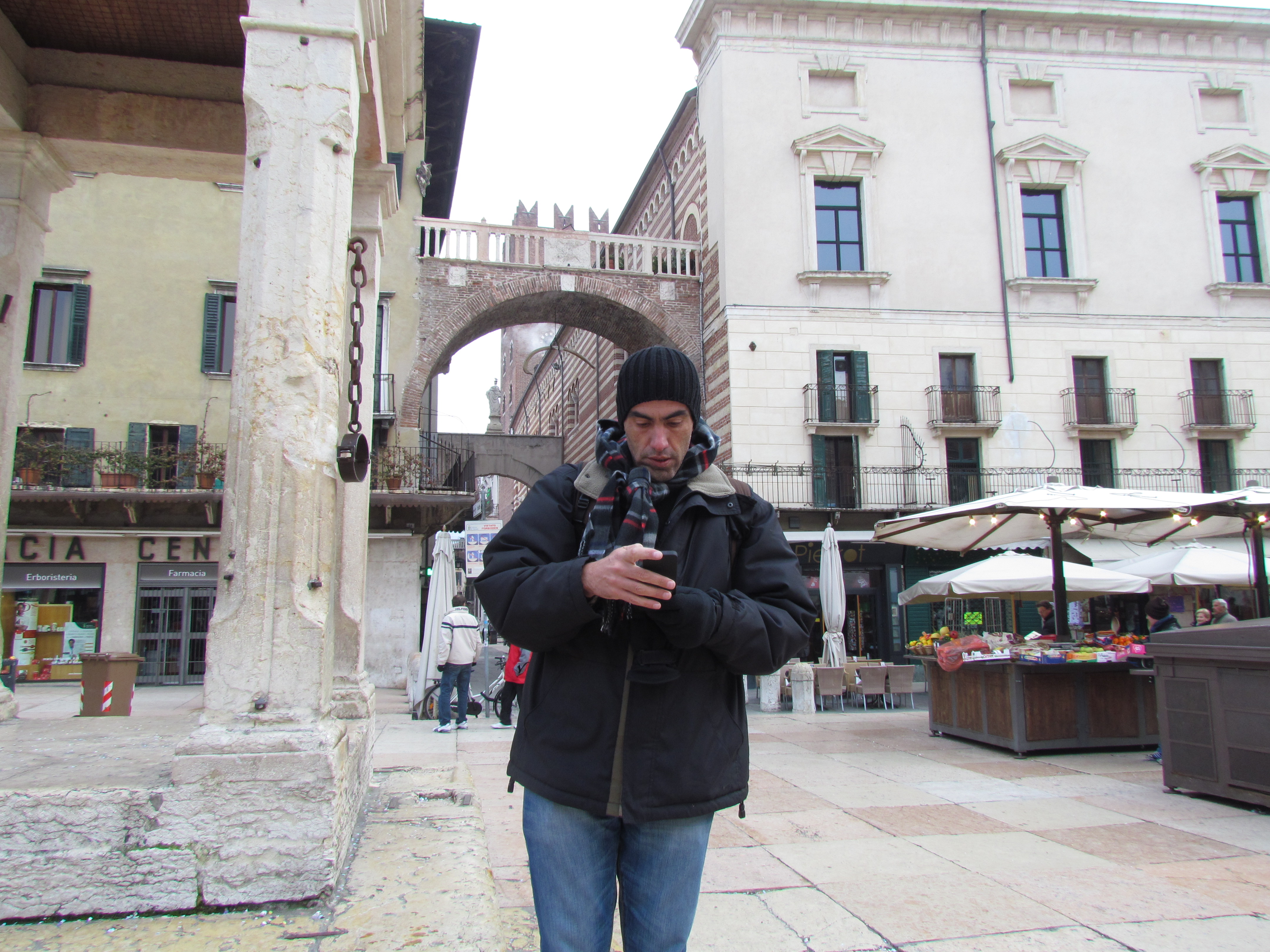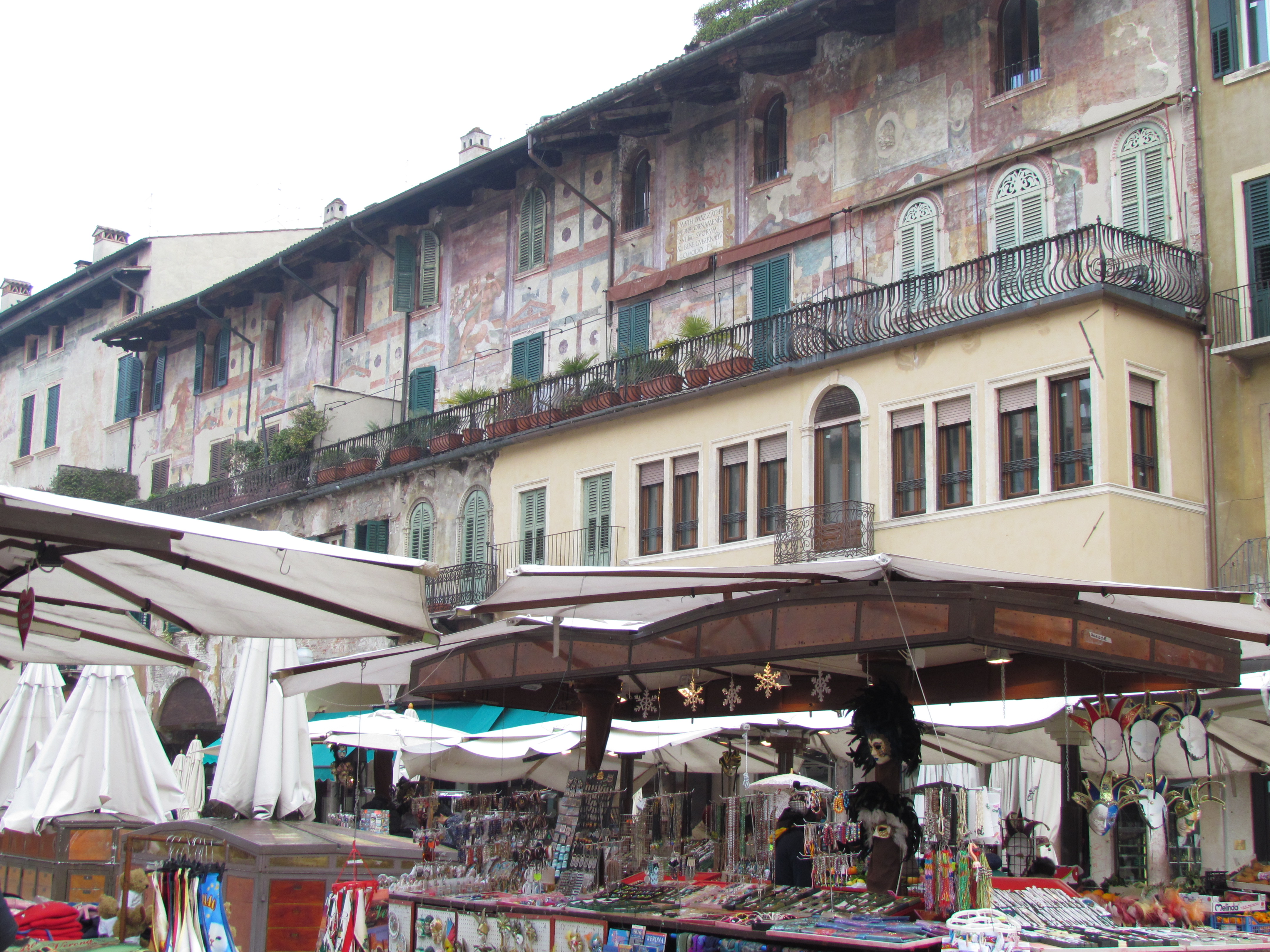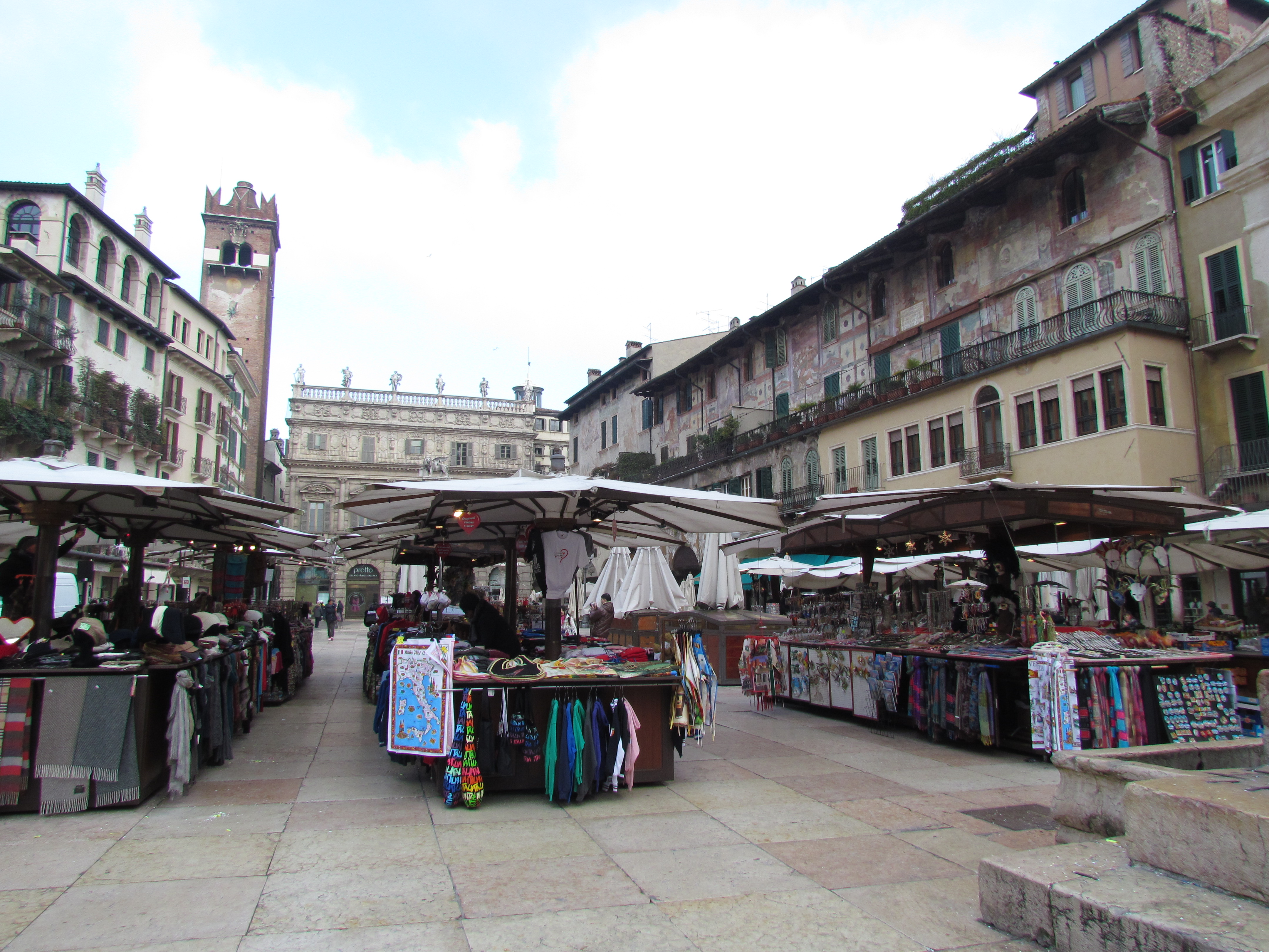 Seguimos então para a Piazza delle Erbe que é uma das mais antigas de Verona. A praça é bem bonita e lá estão os quatro principais palácios da cidade e a Fontana de Madonna Verona. No dia que chegamos havia uma feirinha de artesanatos e já aproveitamos para comprar os imãs e enfeites de Natal que compramos em todas as viagens.