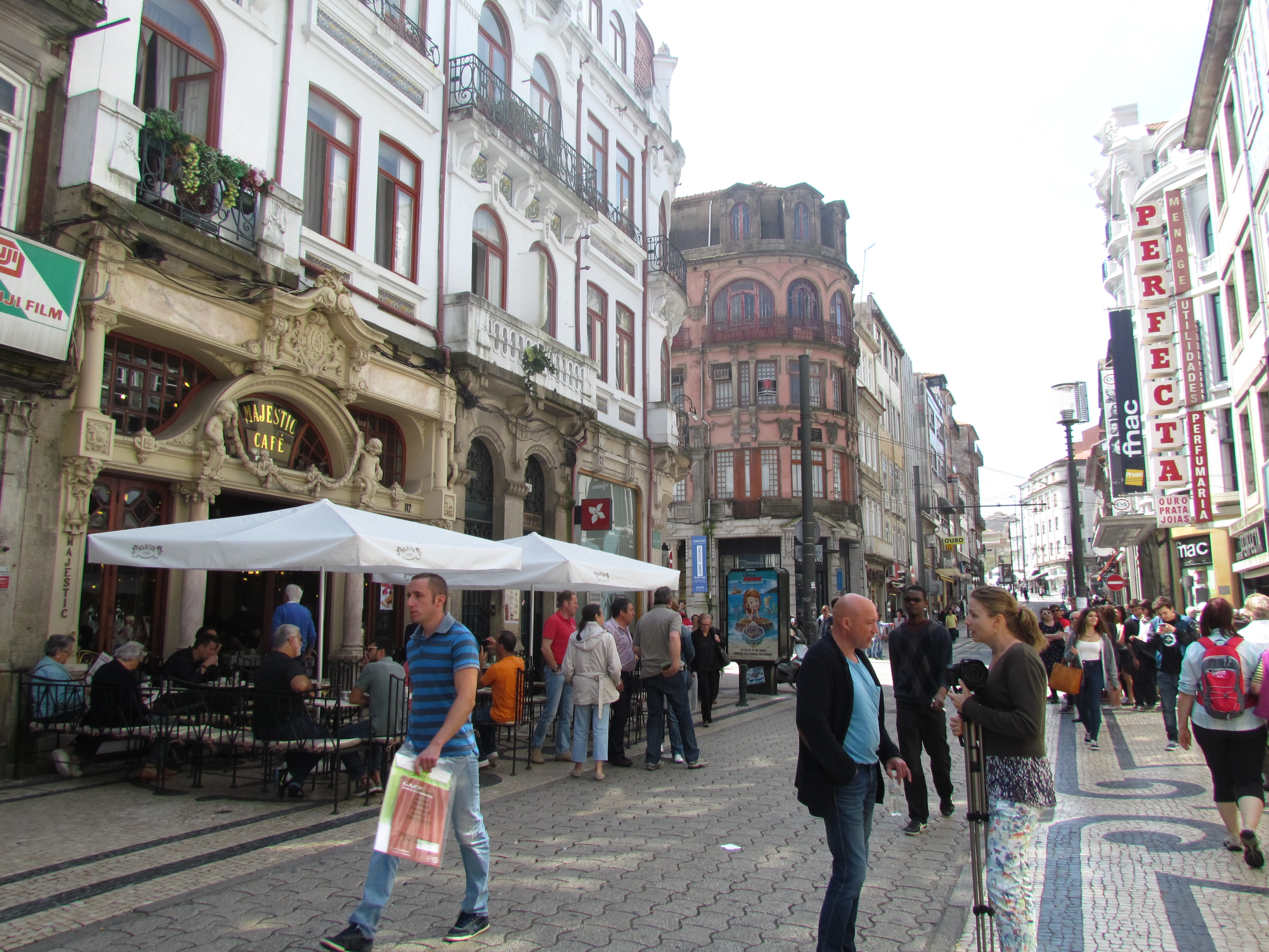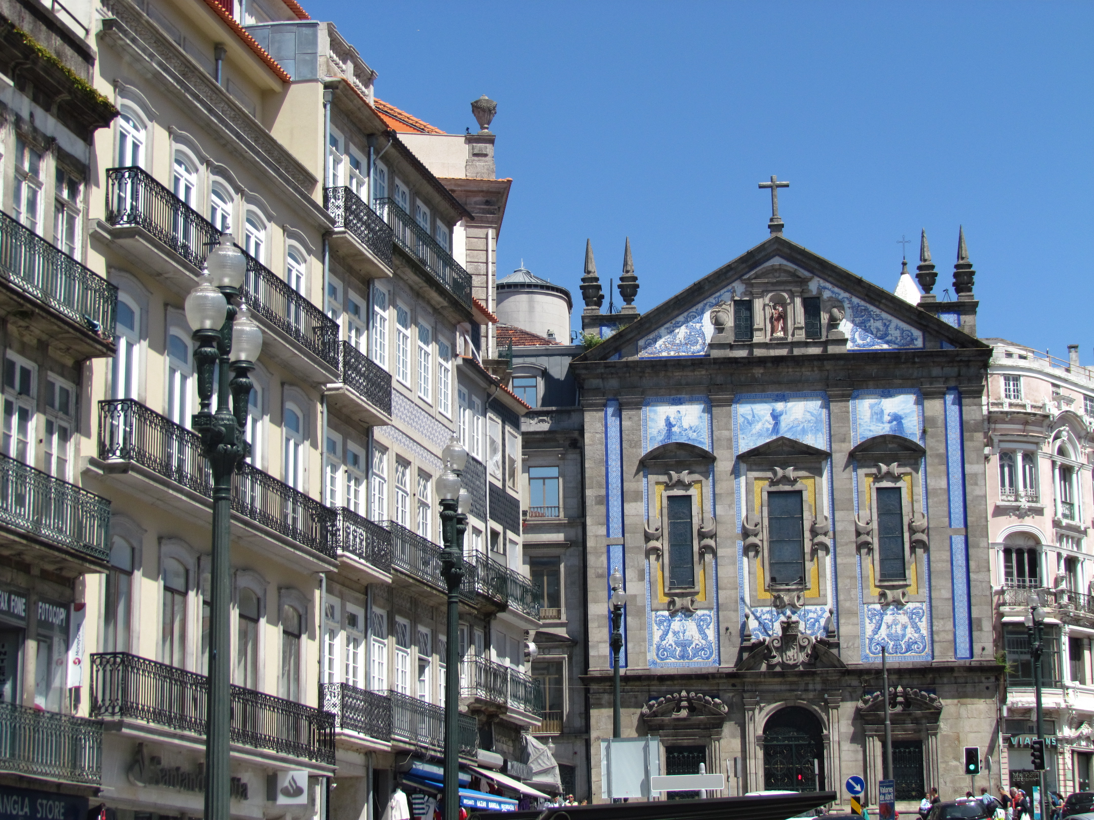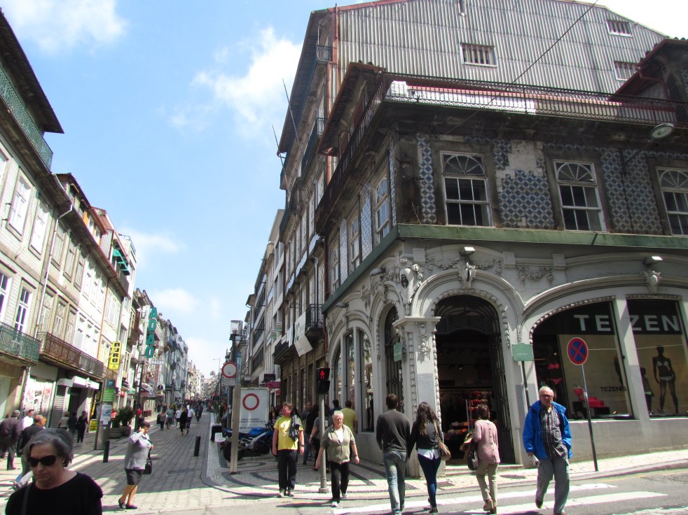 A rua que segue na lateral da Igreja é a mais famosa da cidade: a Rua de Santa Catarina, a principal rua peatonal de comércio de luxo da cidade. Um prédio mais bonito que o outro, entremeados por shoppings, barraquinhas de louças portuguesas e muita gente.