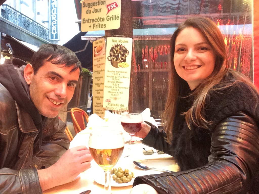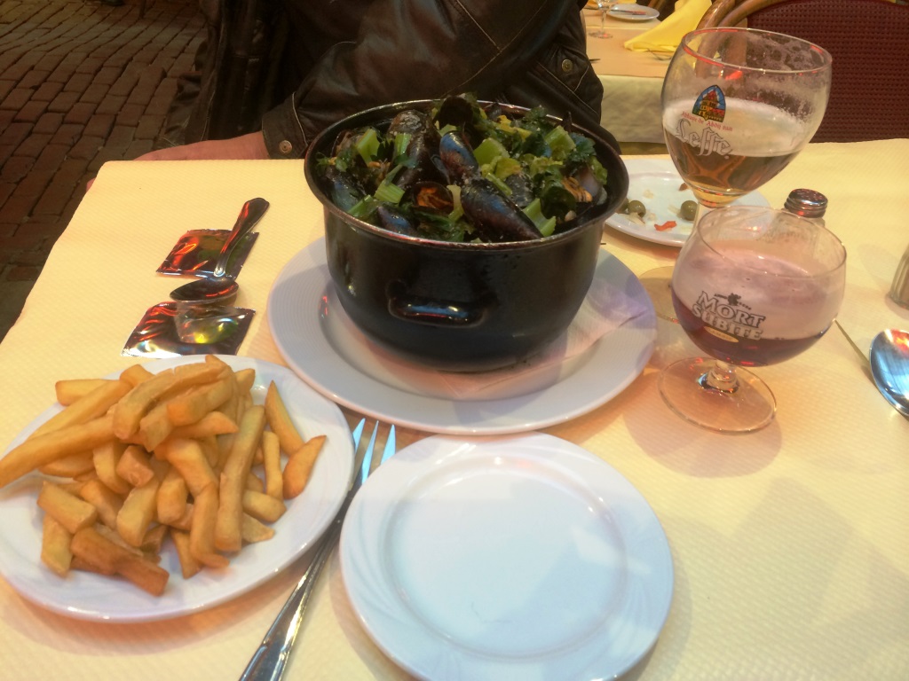 À noite voltamos para a Rue des Bouchers para experimentar o Moule Frites (fritas com mexilhões) regado à cerveja belga. Escolhemos o Restaurante La Terrasse.
