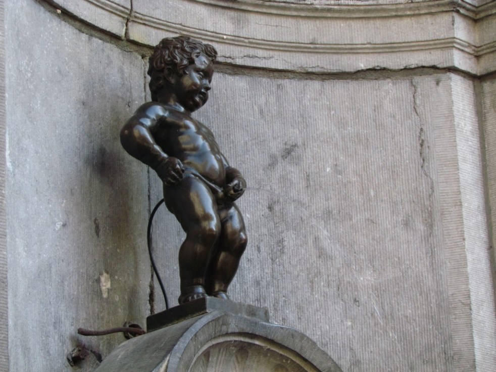 O Manneken Pis é a estátua de 61 cm de um menino urinando. Ele representa a indepemdência da Bélgica e por isso muitos exércitos, especialmente França e Inglaterra, já tentaram roubá-lo. Essa estátua é uma réplica e a verdadeira encontra-se na Maison du Roi junto com a coleção de roupinhas da estátua. Isso mesmo! Ela é vestida conforme a ocasião/ comemoração.