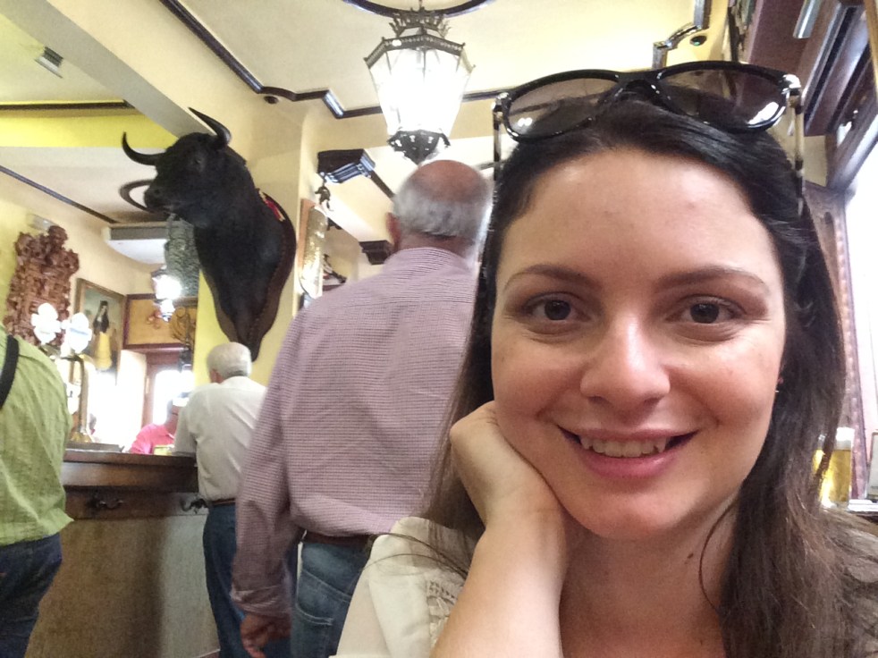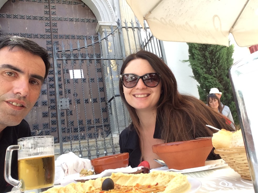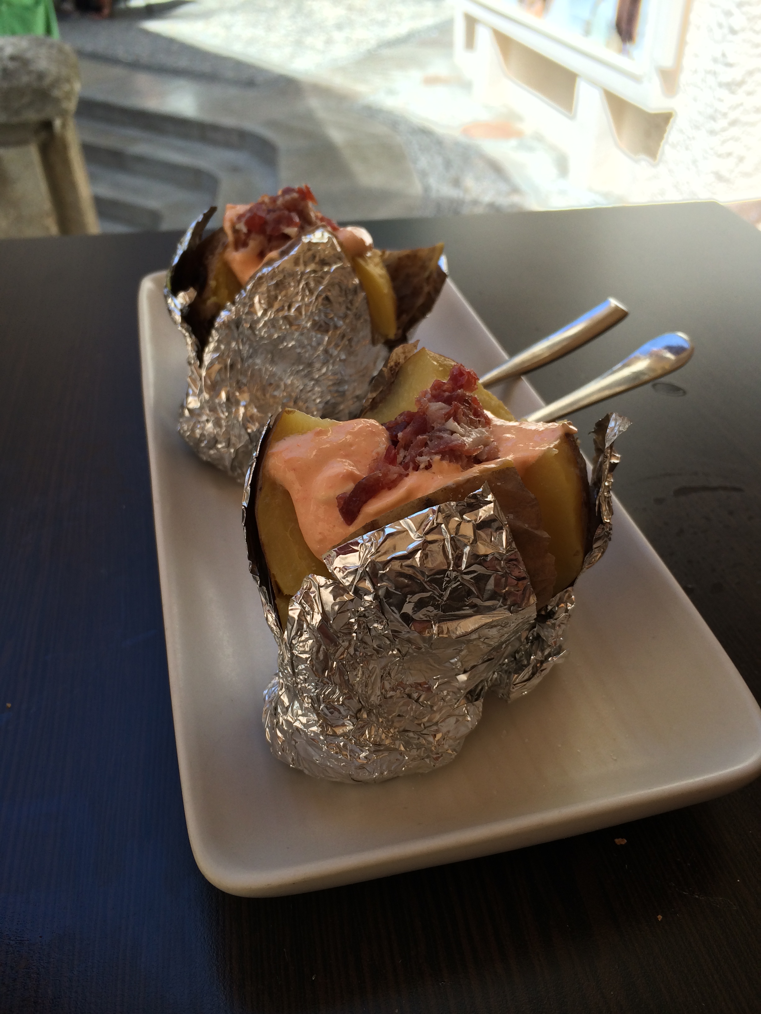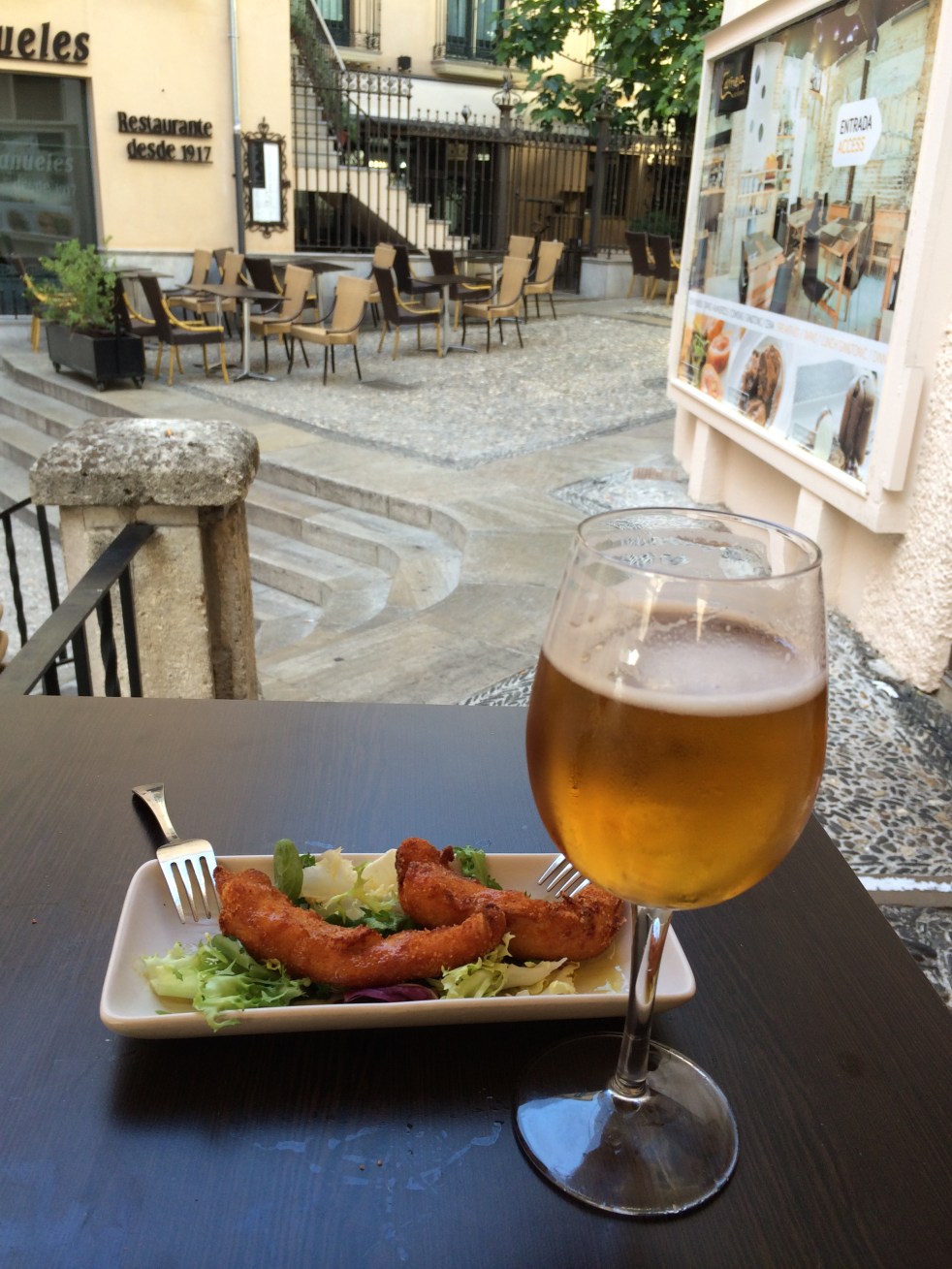 No dia seguinte, para passar o tempo até o horário do nosso vôo de volta à Barcelona, fomos em outro muito bom, mas com ambiente mais moderninho, o Restaurante Carmela onde as tapas também eram maravilhosas: carne assada, batata recheada com cream cheese e bacon, frango empanado com molho picante – e, tudo de graça!