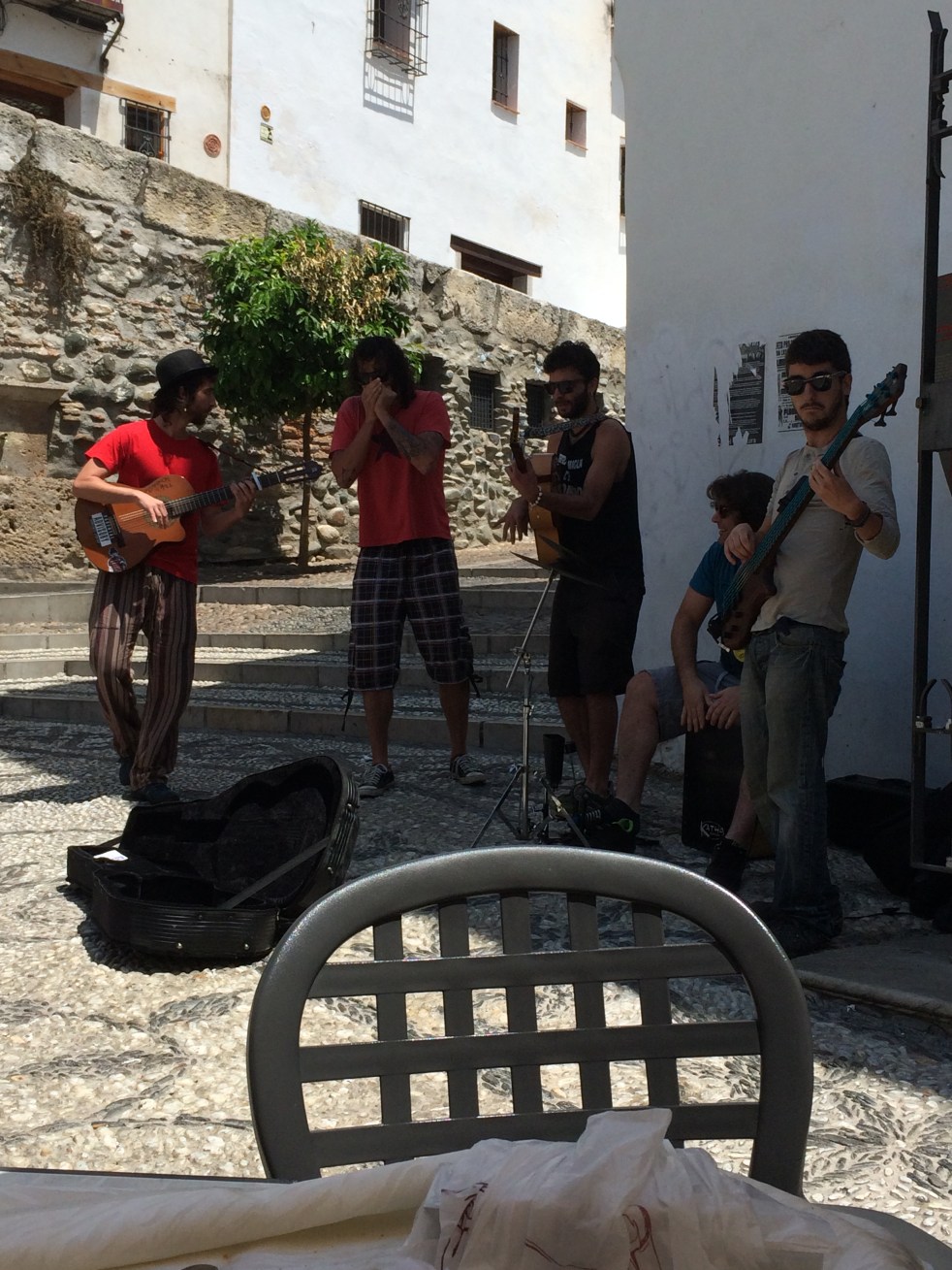 Fazia calor e queríamos sentar do lado de fora e tivemos a sorte de ter música ao vivo bem em frente!