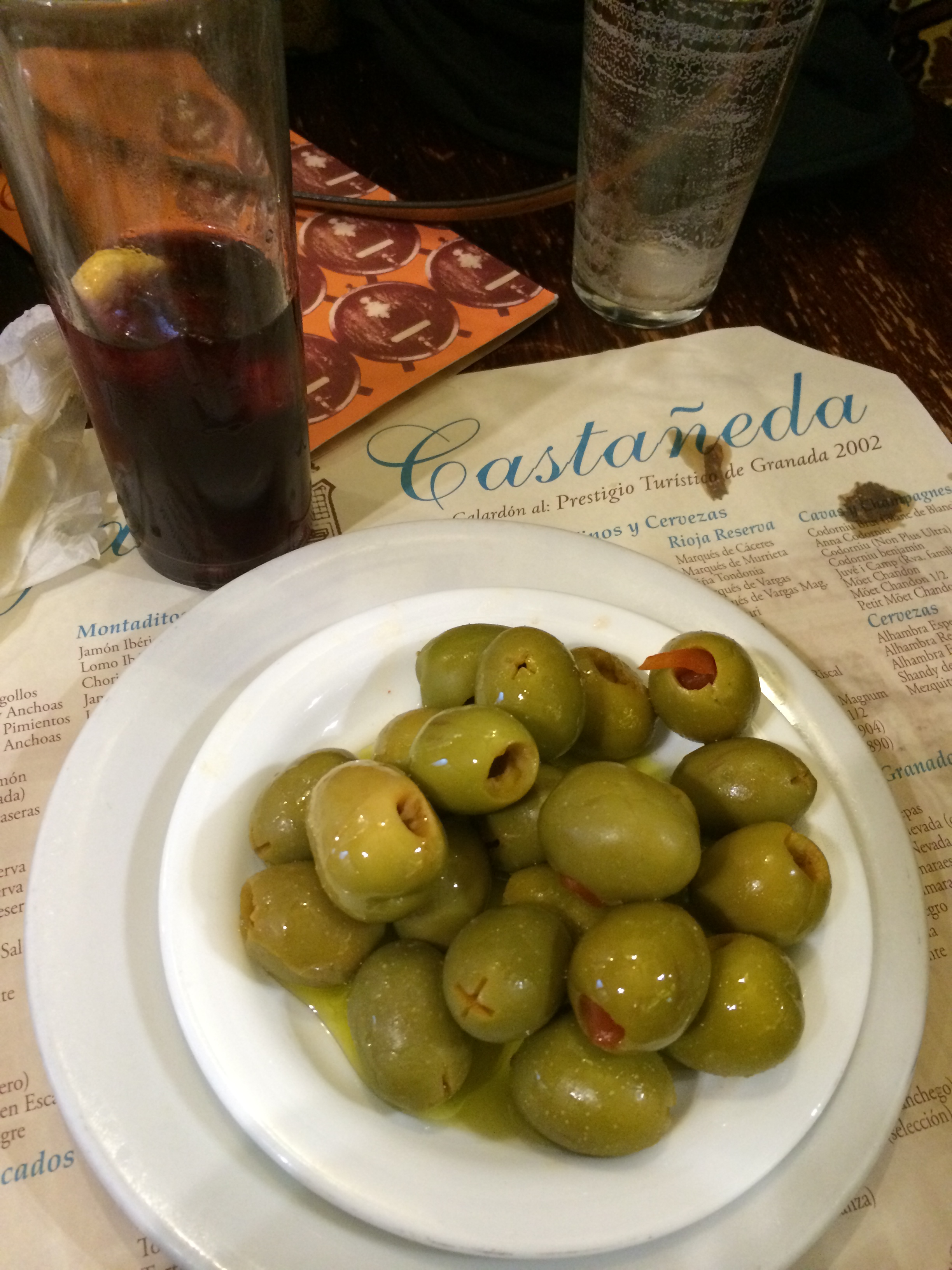 Aqui você vai comer as melhores azeitonas da sua vida. Aliás a Espanha tem as melhores azeitonas marinadas em um tempero especial que só existe lá! E tem mais: Granada é a cidade das tapas. Você não precisa comprar nada para comer, basta pedir uma bebida e pronto, tapas, outra bebida, outra tapa.