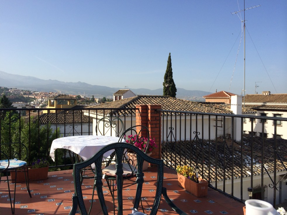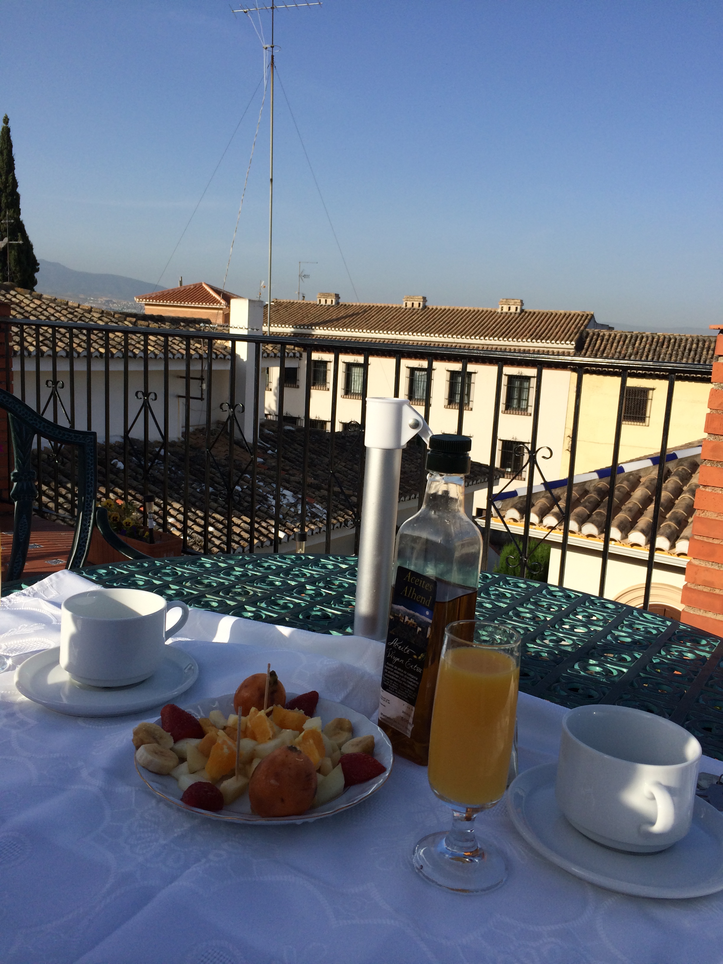A Pousada é simples, mas linda, toda florida e com uma varanda incrível com vista para a Alhambra onde é servido o café da manhã, que é mais do que maravilhoso e completíssimo!!